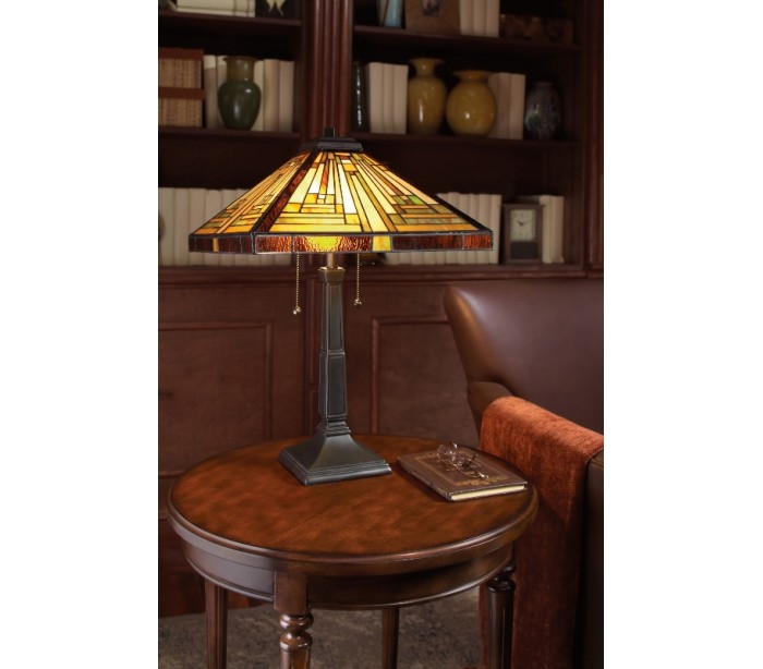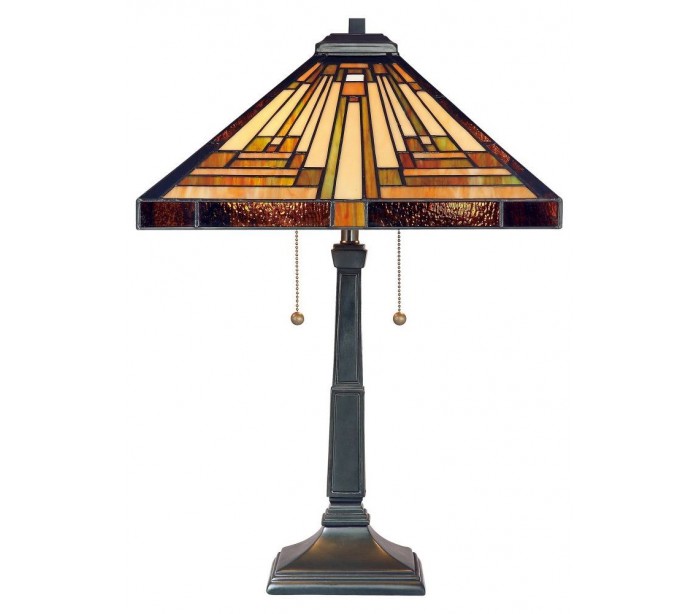 Stephen bordlampe i et smukt Tiffany design, fremstillet med ramme i mørk bronzelakeret metal og skærm i farvet glas. Bordlampen måler 58,4 cm i højden og anvender 2 x E27 lyskilder, max. 60W. Der kan anvendes LED lyskilder.