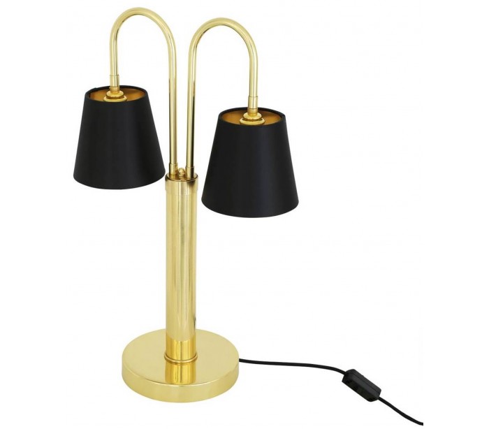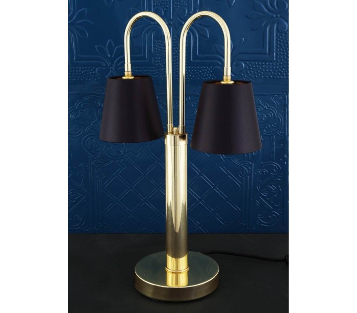 Uppsala bordlampe i et moderne design, fremstillet i poleret messing og med skærme i sort tekstil. Bordlampen har afbryder på ledningen og måler 63 cm i højden.