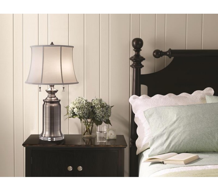 Stateroom bordlampe i et amerikansk design fra Feiss. Lampen måler 68,6 cm i højden og leveres til europæisk standard til 2 x E27 lyskilder. Lampen er udført i et design af antik nikkellakeret stål og med skærm i hvid linned.