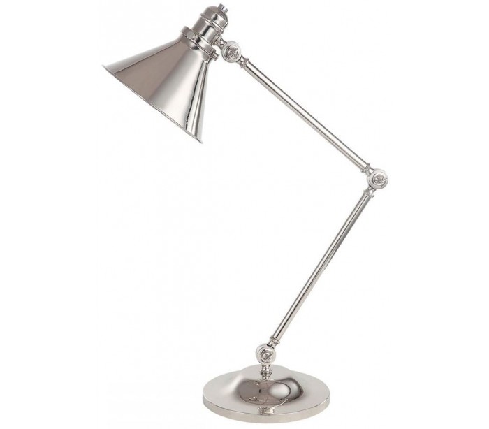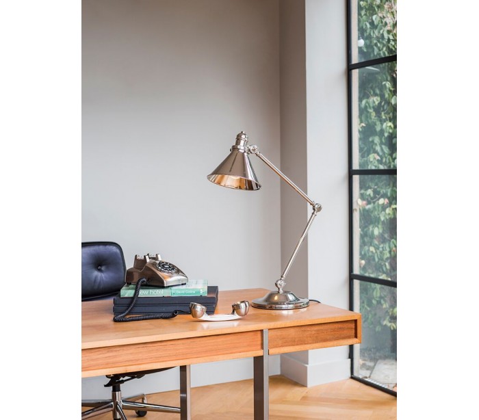 Provence bordlampe fra britiske Elstead. Lampen måler op til 66 cm i højden og leveres til europæisk standard til 1 x E27 lyskilde. Lampen er udført i et design af poleret nikkellakeret stål og er indstillelig i højde og fremspring.
