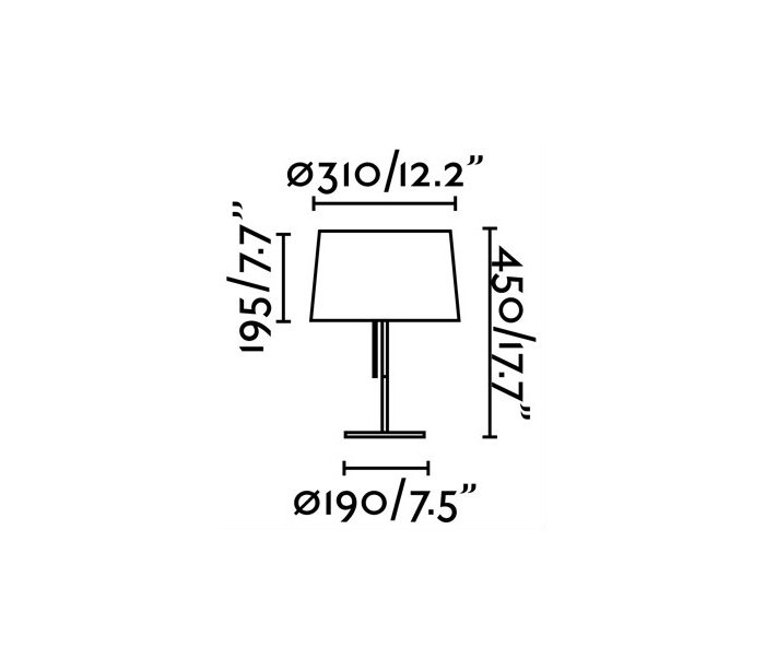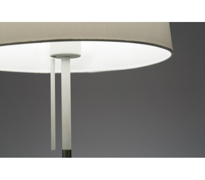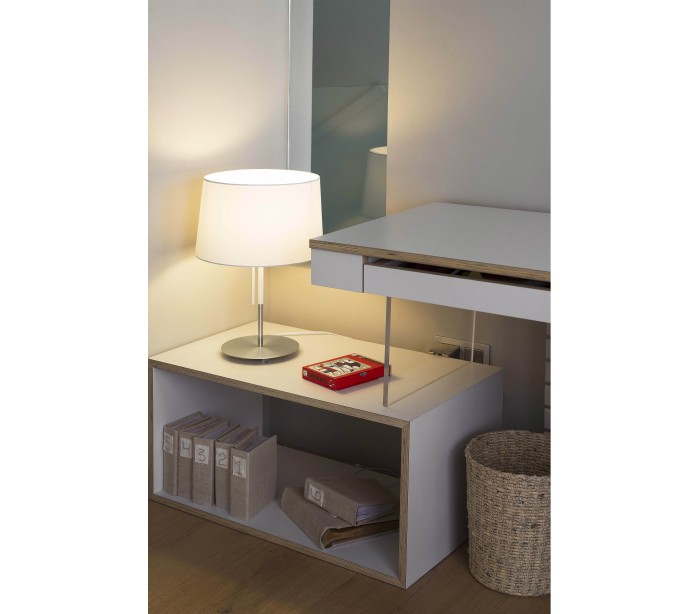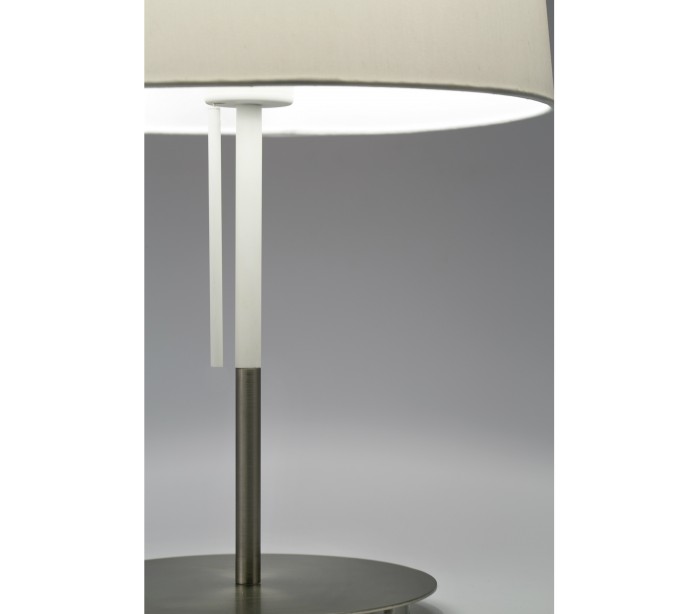 Bordlampe i et moderne design, fremstillet i kromlakeret metal og med skærm i hvid tekstil. Lampen har afbryder under skærmen. Lampen måler 45 cm i højden og anvender 1 x E27 lyskilde på max. 20W (Ekskl.).