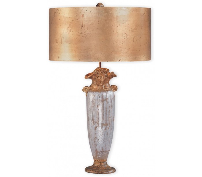 BIENVILLE bordlampe i et design fremstillet i antik sølv og antik guldlakeret stål. Lampen måler 76 cm i højden og leveres til europæisk standard til 1 x E27 lyskilde.