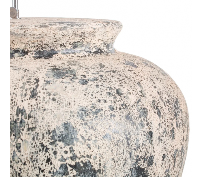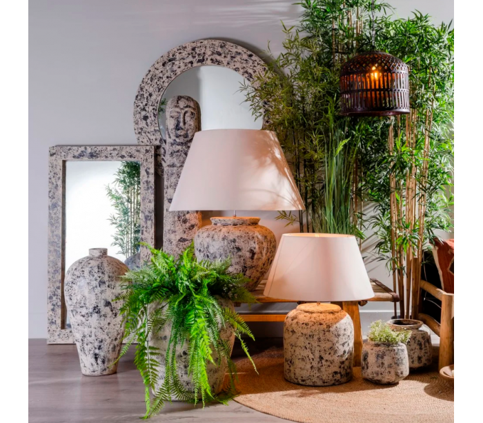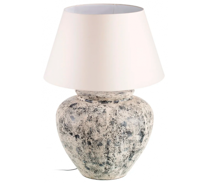 Bordlampe i et design fremstillet i antik beige cement og med skærm i beige tekstil. Bordlampen måler 90 cm i højden og 60 cm i diameter og kommer med 120 cm ledning med afbryder. Lampen anvender 1 x E27 lyskilde (Ekskl.).