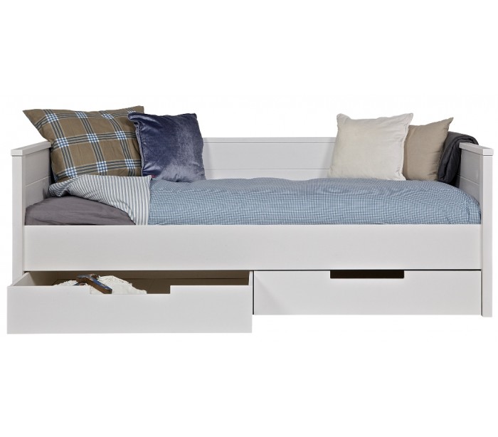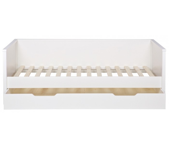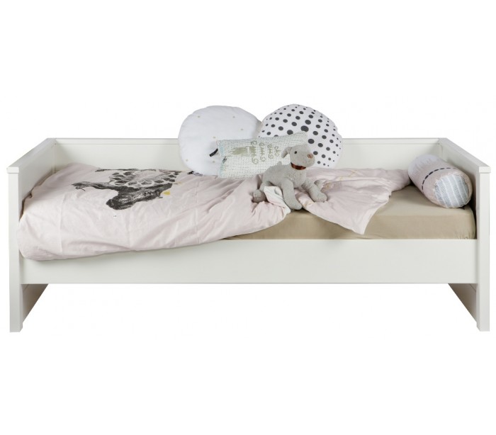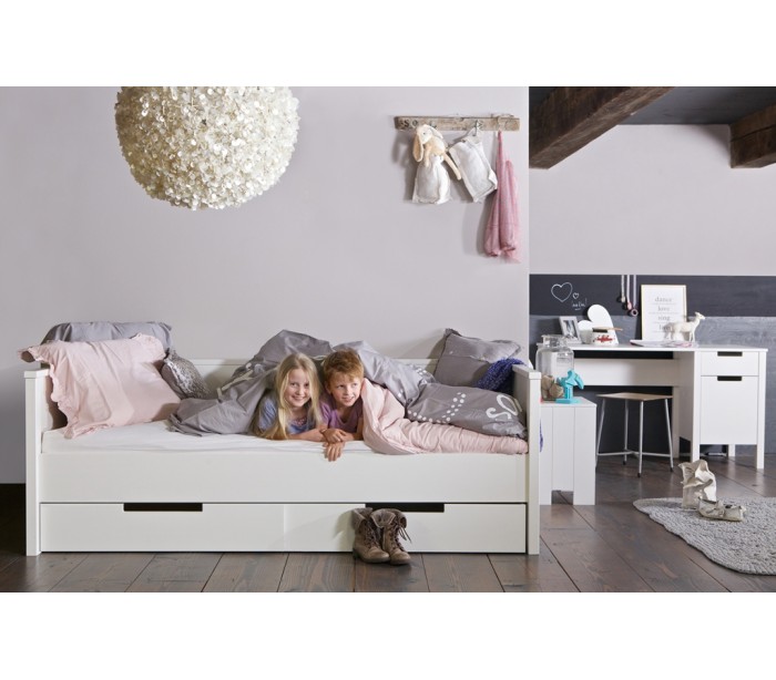 Jade børneseng i et moderne design, fremstillet i hvidlakeret fyrretræ. Sengen måler 209 x 100 cm, og passer sammen med en madras med målene 90 x 200 cm (ikke inkl.). Sengen leveres uden bund og skuffer (tilkøb).