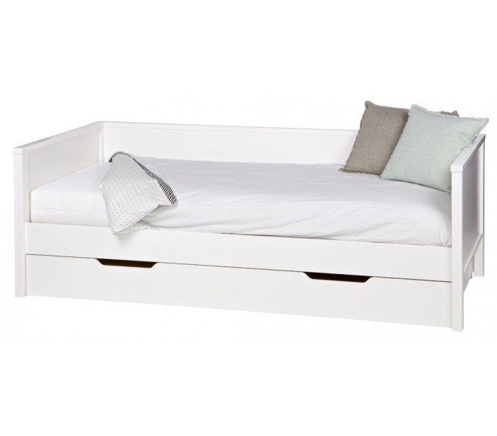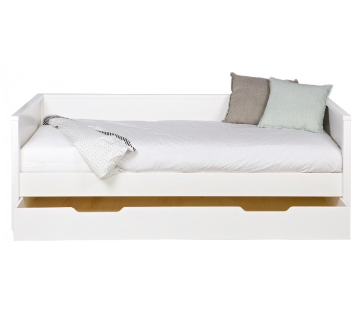 Sengetøjsskuffe i et design, fremstillet i hvidlakeret fyrretræ. Skuffen måler 198 cm i bredden og kommer med hjul, således den er let at føre ind og ud fra under sengen.