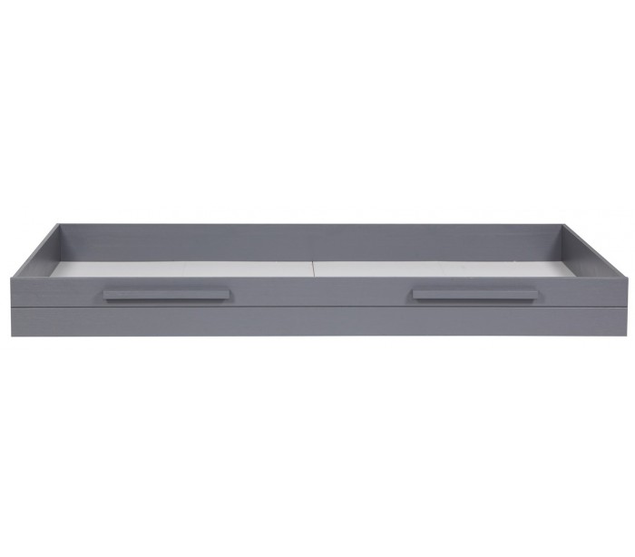 Sengetøjsskuffe i et design, fremstillet i børstet stålgråt lakeret fyrretræ. Skuffen måler 198 cm i bredden og kommer med hjul, således den er let at føre ind og ud fra under sengen.