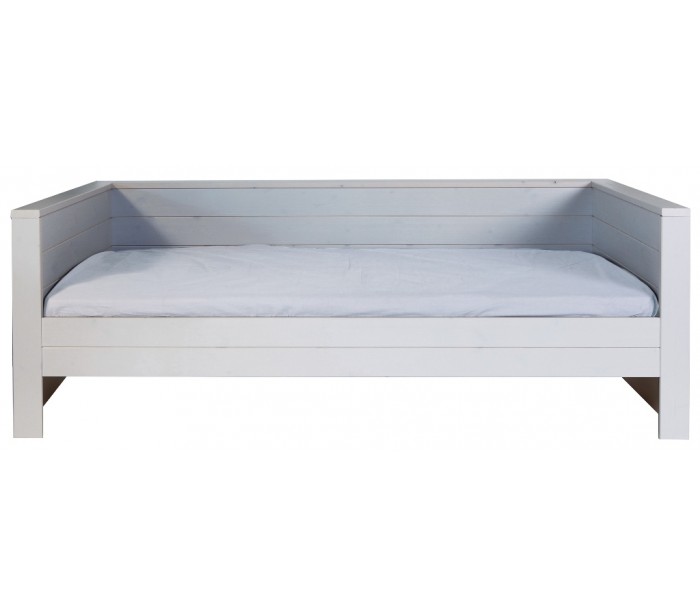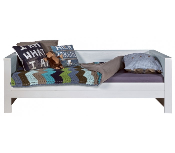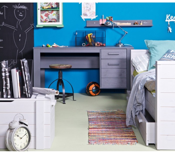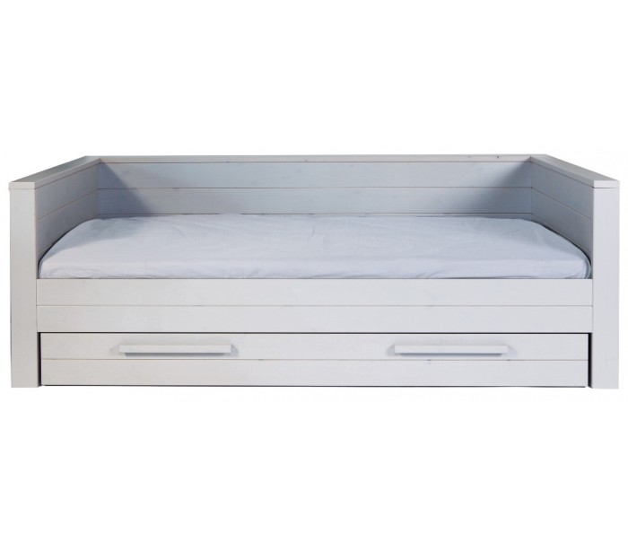 Børneseng i et moderne design, fremstillet i børstet grålakeret fyrretræ. Sengen måler 219 x 101 cm, og passer sammen med en madras med målene 90 x 200 cm (ikke inkl.). Sengen leveres uden bund og skuffe (tilkøb).