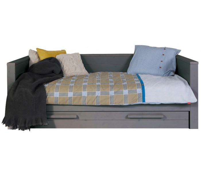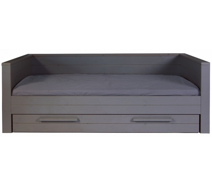 Børneseng i et moderne design, fremstillet i børstet stålgråt lakeret fyrretræ. Sengen måler 219 x 101 cm, og passer sammen med en madras med målene 90 x 200 cm (ikke inkl.). Sengen leveres uden bund og skuffe (tilkøb).