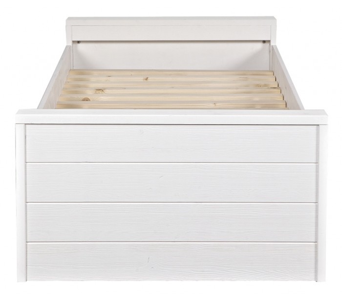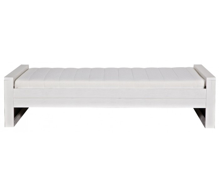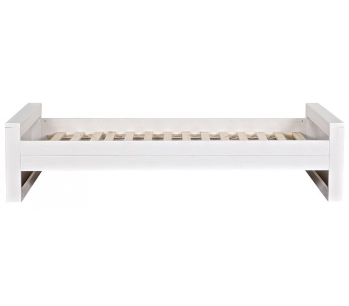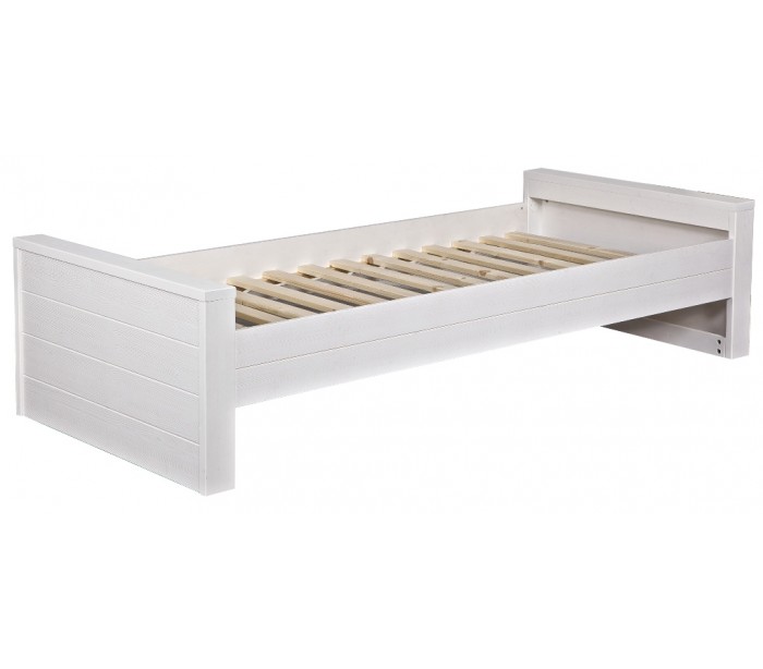 Børneseng i et moderne design, fremstillet i børstet hvidlakeret fyrretræ. Sengen måler 219 x 95 cm, og passer sammen med en madras med målene 90 x 200 cm (ikke inkl.). Sengen leveres uden bund og skuffe (tilkøb).