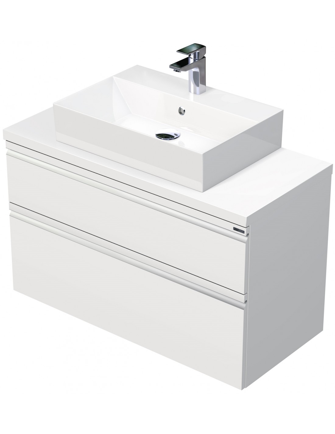 BRAVE Komplet badmiljø med håndvask til bordmonteret armatur. Badmiljøet kommer med 2 skuffer med softclose og er fremstillet i MDF. Håndvasken er fremstillet i hvid keramik. Badmiljøet måler 100 cm i bredden. Det viste armatur medfølger ikke i sættet.
