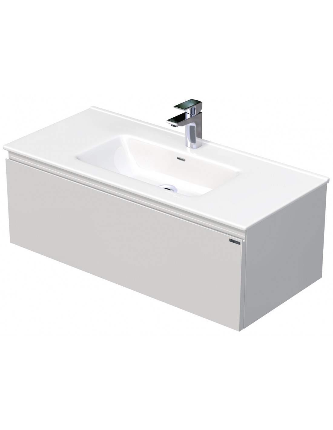 LETTY Komplet badmiljø med håndvask til bordmonteret armatur. Badmiljøet kommer med 1 skuffe med softclose og er fremstillet i MDF. Håndvasken er fremstillet i hvid keramik. Badmiljøet måler 100 / 101 cm i bredden. Det viste armatur medfølger ikke i sættet.