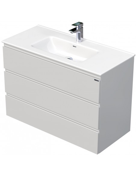 LETTY Komplet badmiljø med håndvask til bordmonteret armatur. Badmiljøet kommer med 3 skuffer med softclose og er fremstillet i MDF. Håndvasken er fremstillet i hvid keramik. Badmiljøet måler 100 / 101 cm i bredden. Det viste armatur medfølger ikke i sættet.