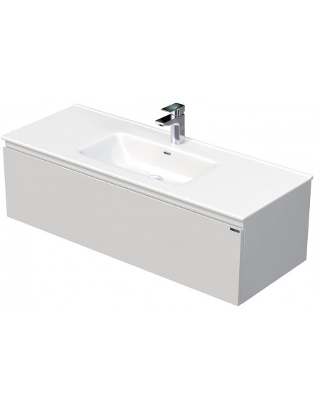 LETTY Komplet badmiljø med håndvask til bordmonteret armatur. Badmiljøet kommer med 1 skuffe med softclose og er fremstillet i MDF. Håndvasken er fremstillet i hvid keramik. Badmiljøet måler 120 / 121 cm i bredden. Det viste armatur medfølger ikke i sættet.