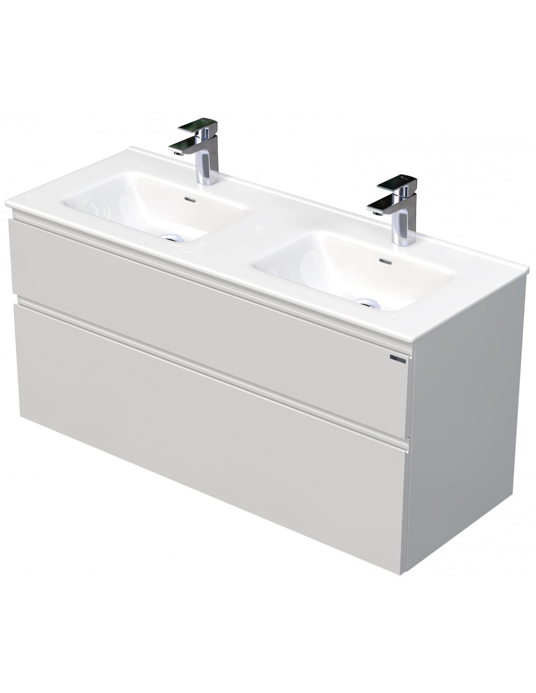 LETTY Komplet badmiljø med dobbelt håndvask til bordmonteret armatur. Badmiljøet kommer med 2 skuffer med softclose og er fremstillet i MDF. Håndvasken er fremstillet i hvid keramik. Badmiljøet måler 120 / 121 cm i bredden. De viste armaturer medfølger ikke i sættet.