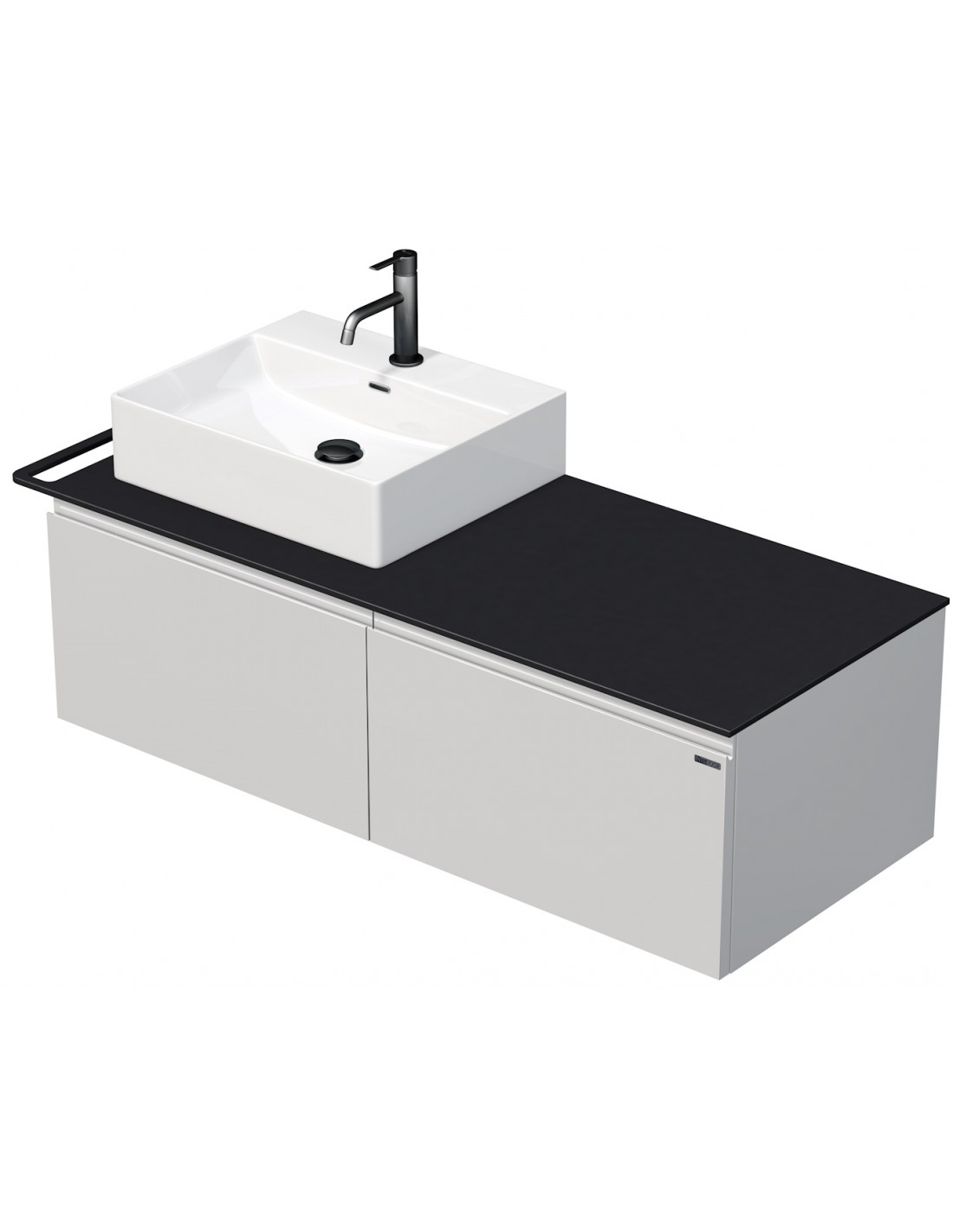 TARA Komplet badmiljø med 1 håndvask til bordmonteret armaturer. Badmiljøet kommer med 2 skuffer med softclose og er fremstillet i HPL og MDF. Håndvasken er fremstillet i keramik. Badmiljøet måler 128 cm i bredden. Det viste armatur og bundventil medfølger ikke i sættet.