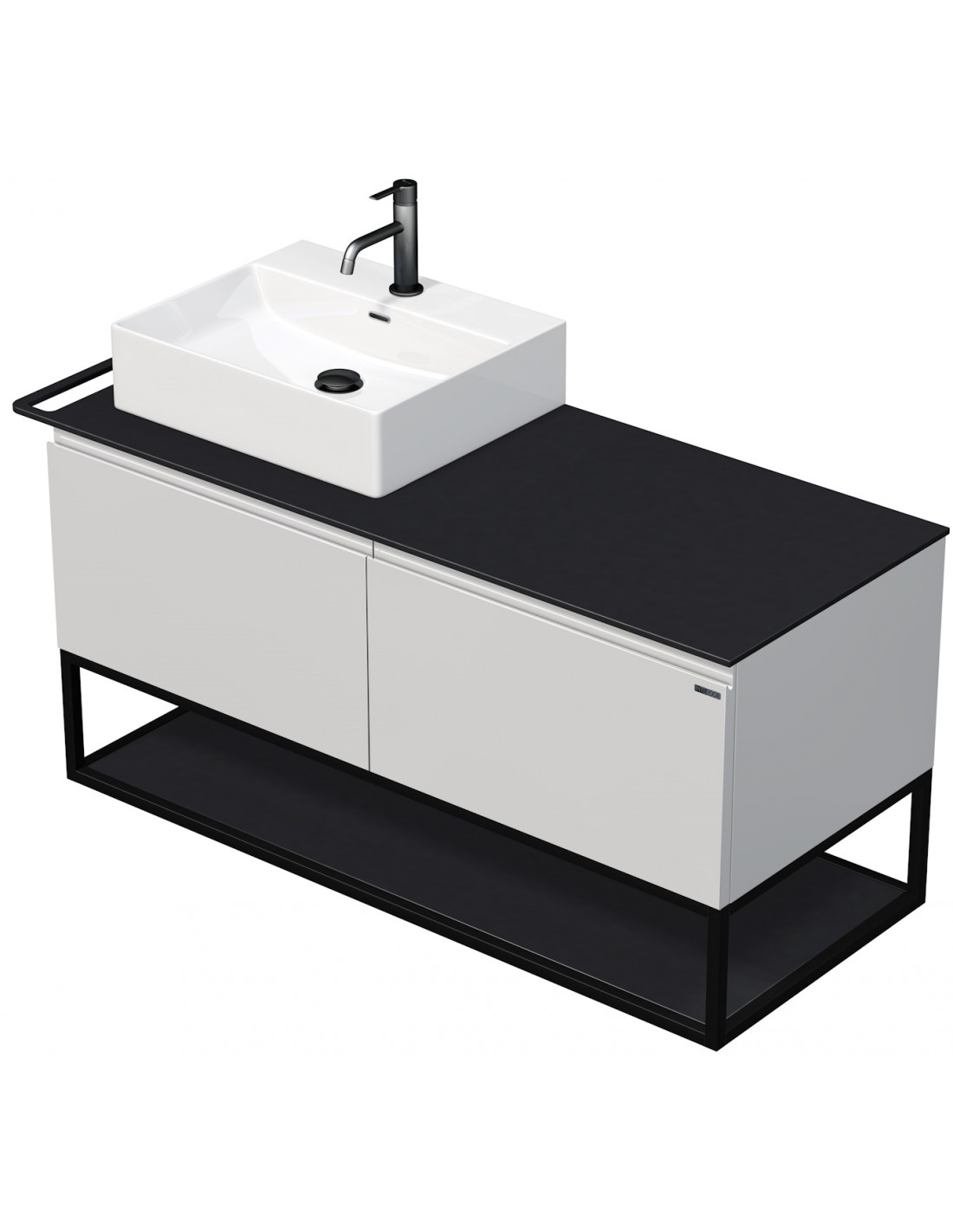 TARA Komplet badmiljø med 1 håndvask til bordmonteret armatur. Badmiljøet kommer med 2 skuffer med softclose og er fremstillet i HPL og MDF. Hertil opbevaringshylde i aluminium, til ekstra opbevaring. Håndvasken er fremstillet i keramik. Badmiljøet måler 128 cm i bredden. Det viste armatur og bundventil medfølger ikke i sættet.