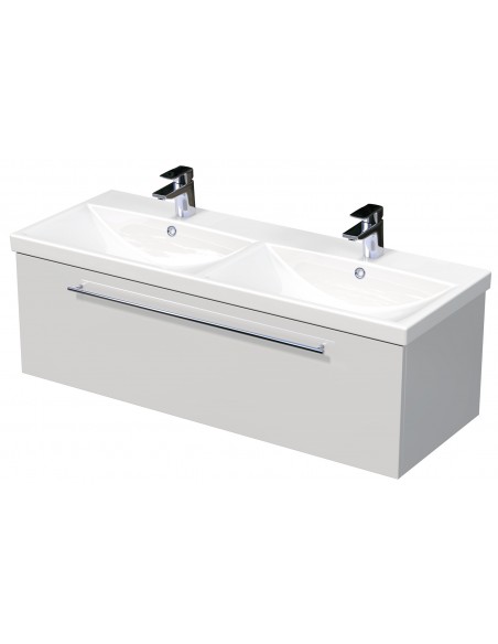 ELITE Komplet badmiljø med dobbelt håndvask til bordmonteret armatur. Badmiljøet kommer med 1 skuffe med softclose og er fremstillet i MDF. Håndvaskene er fremstillet i hvid keramik. Badmiljøet måler 120 cm i bredden. De viste armaturer samt bundventiler medfølger ikke i sættet.