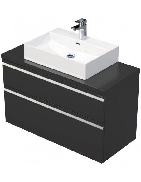 BRAVE Komplet badmiljø med håndvask til bordmonteret armatur. Badmiljøet kommer med 2 skuffer med softclose og er fremstillet i MDF. Håndvasken er fremstillet i hvid keramik. Badmiljøet måler 100 cm i bredden. Det viste armatur medfølger ikke i sættet.