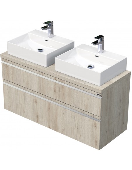 BRAVE Komplet badmiljø med dobbelt håndvask til bordmonteret armatur. Badmiljøet kommer med 2 skuffer med softclose og er fremstillet i MDF. Håndvasken er fremstillet i hvid keramik. Badmiljøet måler 120 cm i bredden. De viste armaturer medfølger ikke i sættet.