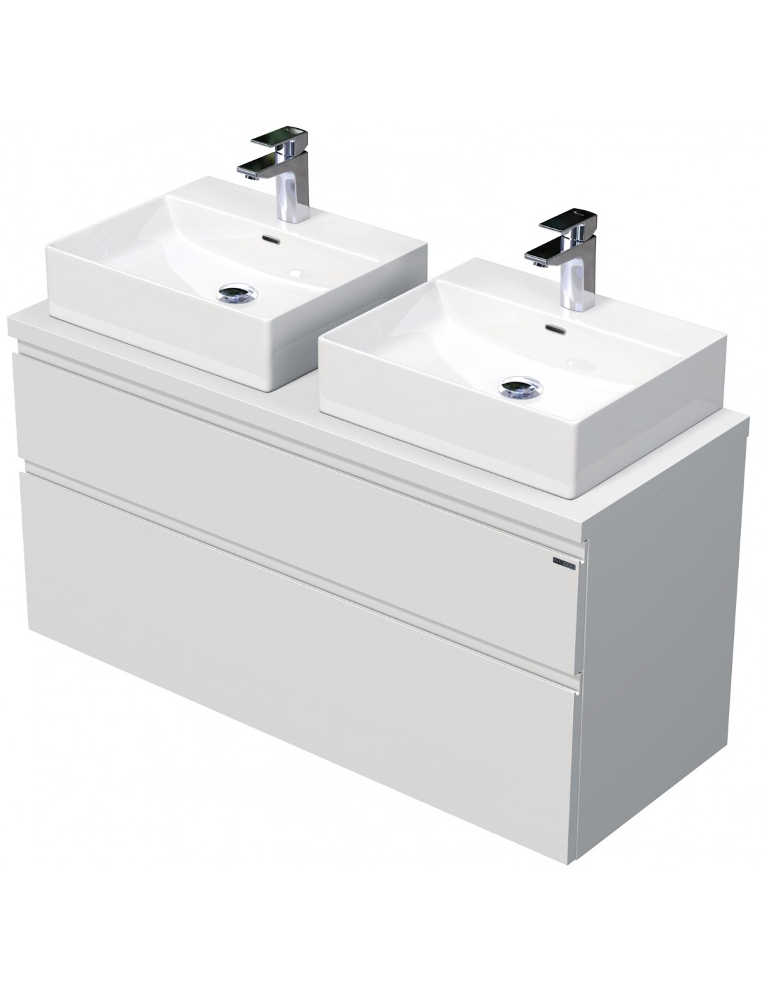 LETTY Komplet badmiljø med dobbelt håndvask til bordmonteret armatur. Badmiljøet kommer med 2 skuffer med softclose og er fremstillet i MDF. Håndvasken er fremstillet i hvid keramik. Badmiljøet måler 120 cm i bredden. De viste armaturer medfølger ikke i sættet.