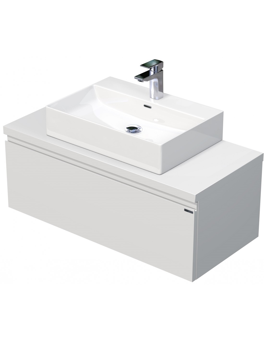 LETTY Komplet badmiljø med håndvask til bordmonteret armatur. Badmiljøet kommer med 1 skuffe med softclose og er fremstillet i MDF. Håndvasken er fremstillet i hvid keramik. Badmiljøet måler 100 cm i bredden. Det viste armatur medfølger ikke i sættet.