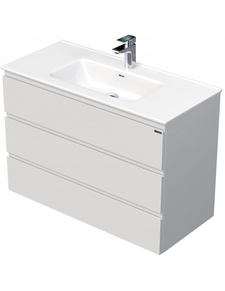 LETTY Komplet badmiljø med håndvask til bordmonteret armatur. Badmiljøet kommer med 3 skuffer med softclose og er fremstillet i MDF. Håndvasken er fremstillet i hvid keramik. Badmiljøet måler 100 / 101 cm i bredden. Det viste armatur medfølger ikke i sættet.