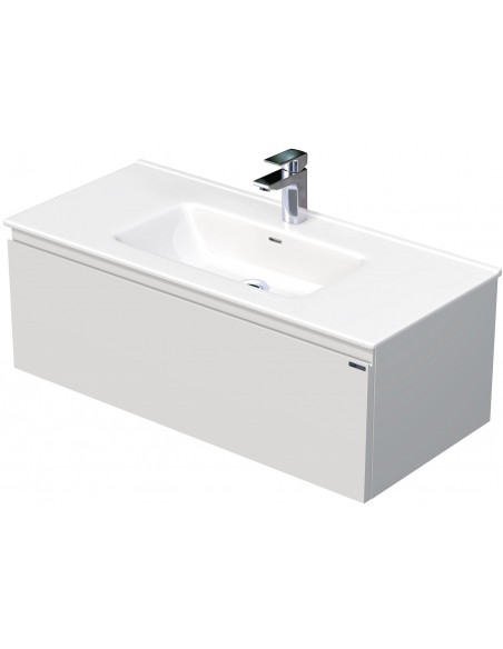 LETTY Komplet badmiljø med håndvask til bordmonteret armatur. Badmiljøet kommer med 1 skuffe med softclose og er fremstillet i MDF. Håndvasken er fremstillet i hvid keramik. Badmiljøet måler 100 / 101 cm i bredden. Det viste armatur medfølger ikke i sættet.