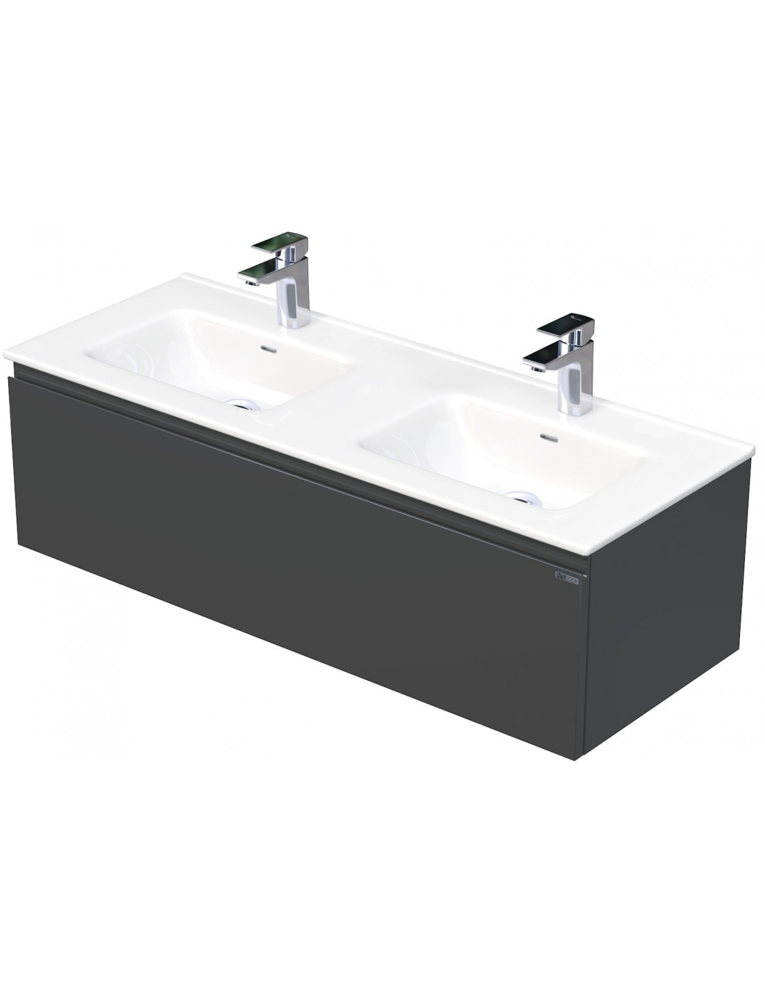 LETTY Komplet badmiljø med dobbelt håndvask til bordmonteret armatur. Badmiljøet kommer med 1 skuffe med softclose og er fremstillet i MDF. Håndvasken er fremstillet i hvid keramik. Badmiljøet måler 120 / 121 cm i bredden. De viste armaturer medfølger ikke i sættet.