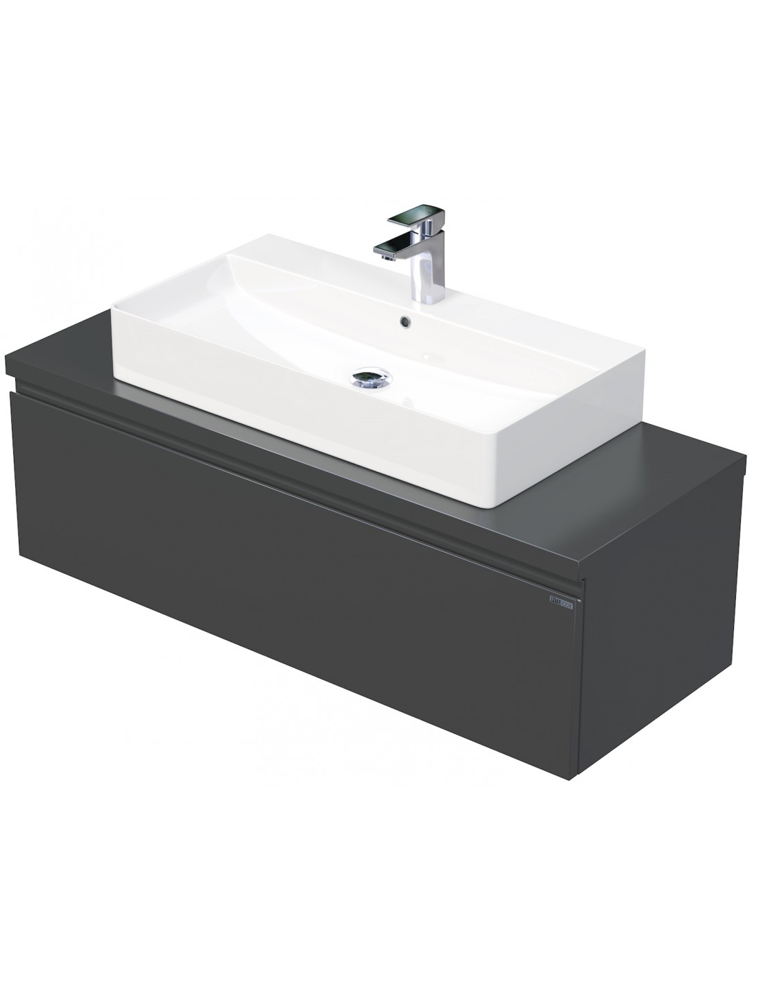 LETTY Komplet badmiljø med håndvask til bordmonteret armatur. Badmiljøet kommer med 1 skuffe med softclose og er fremstillet i MDF. Håndvasken er fremstillet i hvid keramik. Badmiljøet måler 120 cm i bredden. Det viste armatur medfølger ikke i sættet.