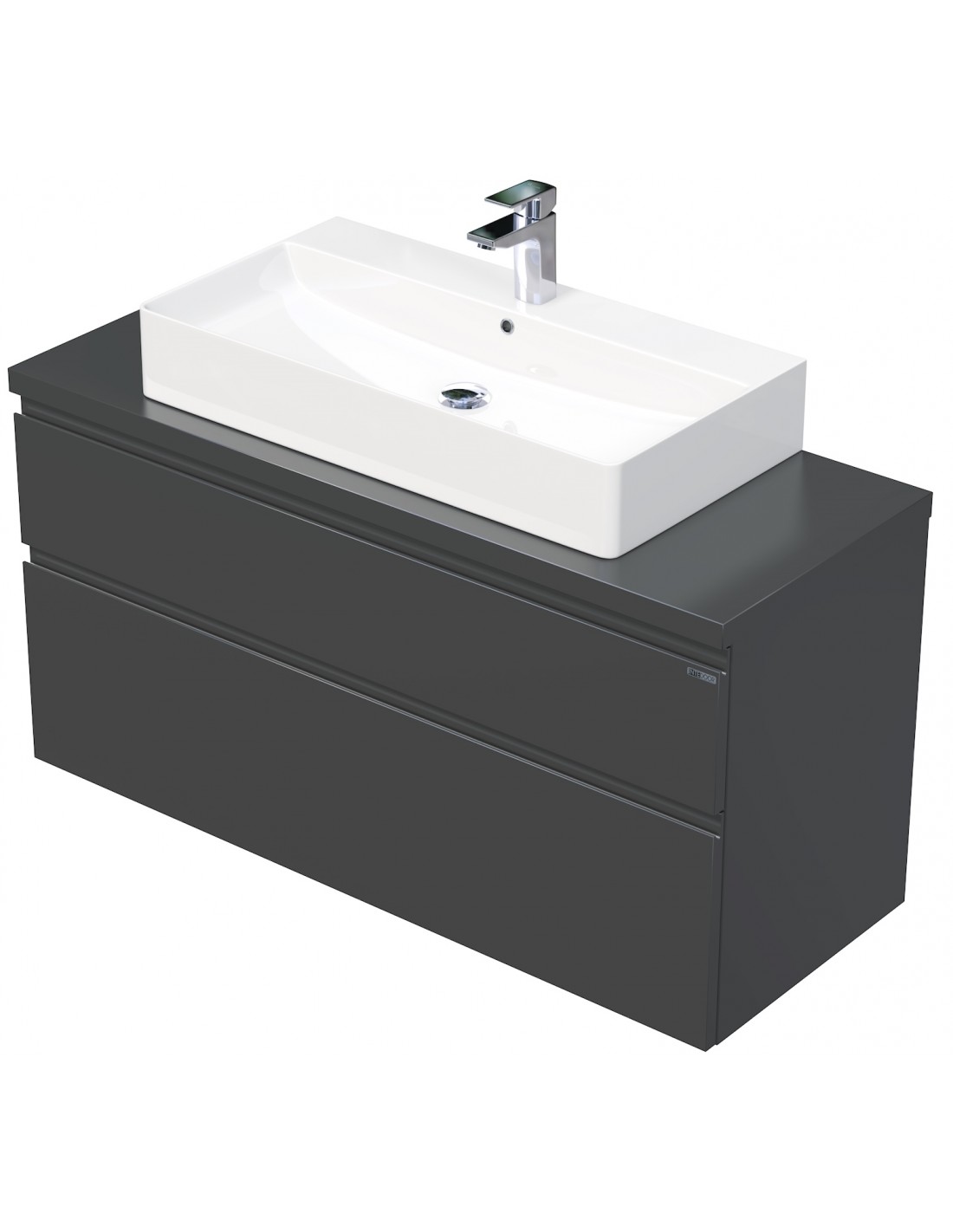 LETTY Komplet badmiljø med håndvask til bordmonteret armatur. Badmiljøet kommer med 2 skuffer med softclose og er fremstillet i MDF. Håndvasken er fremstillet i hvid keramik. Badmiljøet måler 120 cm i bredden. Det viste armatur medfølger ikke i sættet.
