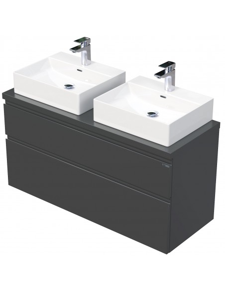 LETTY Komplet badmiljø med dobbelt håndvask til bordmonteret armatur. Badmiljøet kommer med 2 skuffer med softclose og er fremstillet i MDF. Håndvasken er fremstillet i hvid keramik. Badmiljøet måler 120 cm i bredden. De viste armaturer medfølger ikke i sættet.
