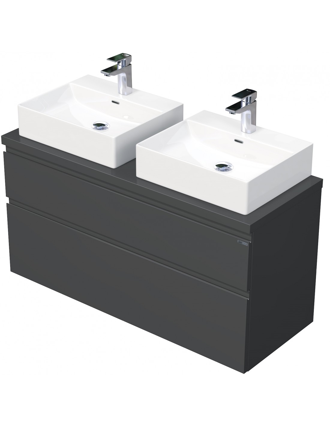 LETTY Komplet badmiljø med dobbelt håndvask til bordmonteret armatur. Badmiljøet kommer med 2 skuffer med softclose og er fremstillet i MDF. Håndvasken er fremstillet i hvid keramik. Badmiljøet måler 120 cm i bredden. De viste armaturer medfølger ikke i sættet.