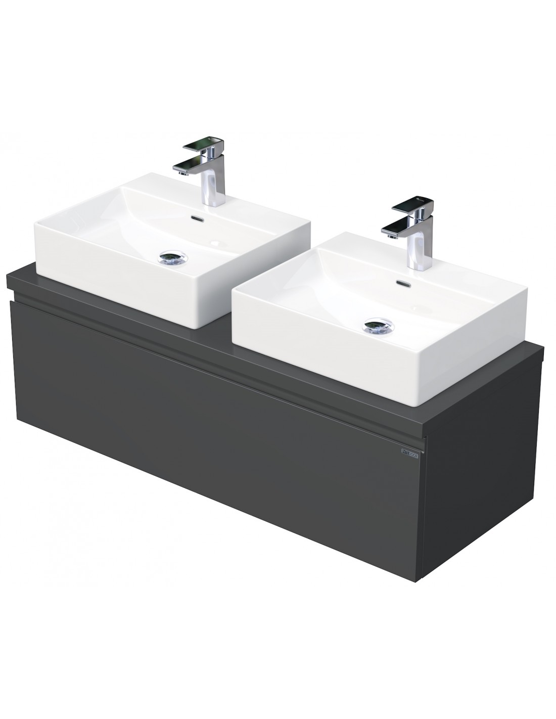 LETTY Komplet badmiljø med dobbelt håndvask til bordmonteret armatur. Badmiljøet kommer med 1 skuffe med softclose og er fremstillet i MDF. Håndvasken er fremstillet i hvid keramik. Badmiljøet måler 120 cm i bredden. De viste armaturer medfølger ikke i sættet.