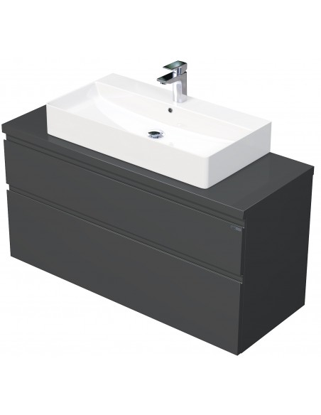 LETTY Komplet badmiljø med håndvask til bordmonteret armatur. Badmiljøet kommer med 2 skuffer med softclose og er fremstillet i MDF. Håndvasken er fremstillet i hvid keramik. Badmiljøet måler 120 cm i bredden. Det viste armatur medfølger ikke i sættet.