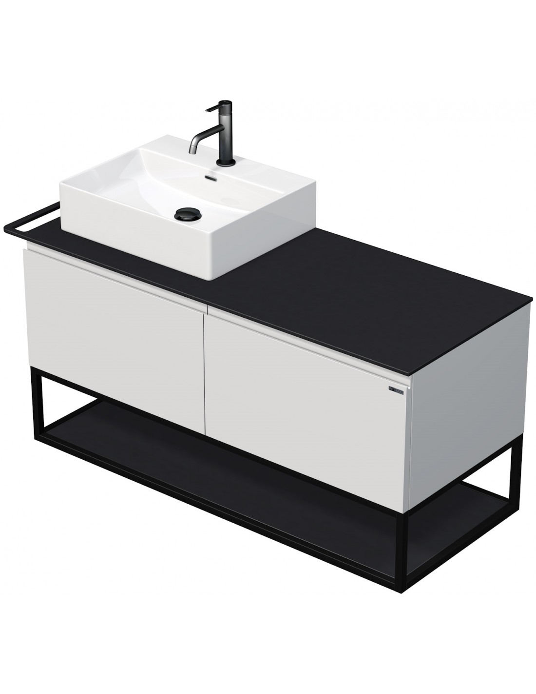 TARA Komplet badmiljø med 1 håndvask til bordmonteret armatur. Badmiljøet kommer med 2 skuffer med softclose og er fremstillet i HPL og MDF. Hertil opbevaringshylde i aluminium, til ekstra opbevaring. Håndvasken er fremstillet i keramik. Badmiljøet måler 128 cm i bredden. Det viste armatur og bundventil medfølger ikke i sættet.