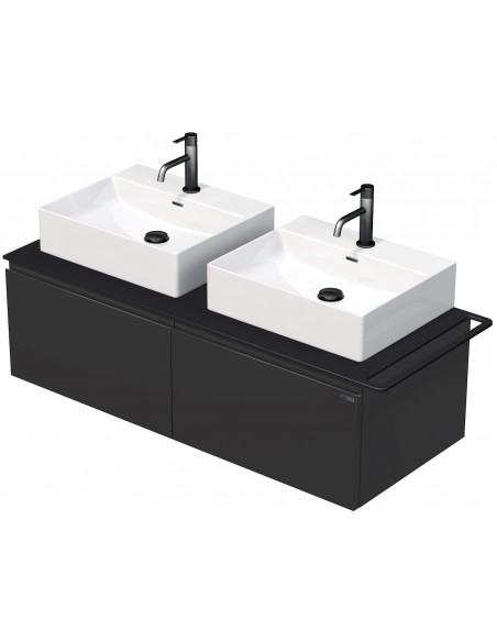 TARA Komplet badmiljø med 2 håndvaske til bordmonterede armaturer. Badmiljøet kommer med 2 skuffer med softclose og er fremstillet i HPL og MDF. Håndvaskene er fremstillet i keramik. Badmiljøet måler 128 cm i bredden. De viste armaturer og bundventiler medfølger ikke i sættet.
