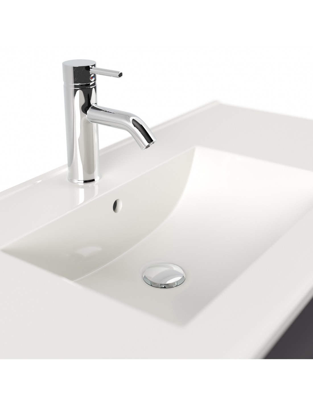 Komplet badmiljø med vask, udført i et design af mdf og mineralsten. Badmiljøet måler 54 cm i højden og 100 x 46 cm i bredde og dybde.