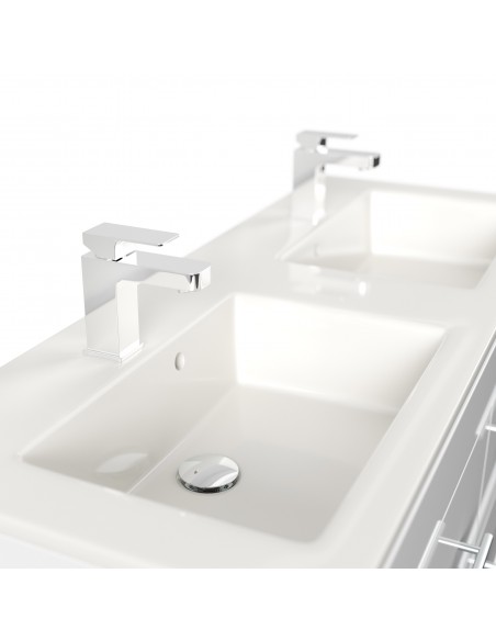 Komplet dobbelt badmiljø med vask, udført i et design af mdf og mineralsten. Badmiljøet måler 57 cm i højden og 120 x 46 cm i bredde og dybde.