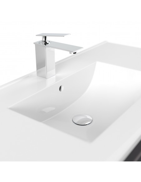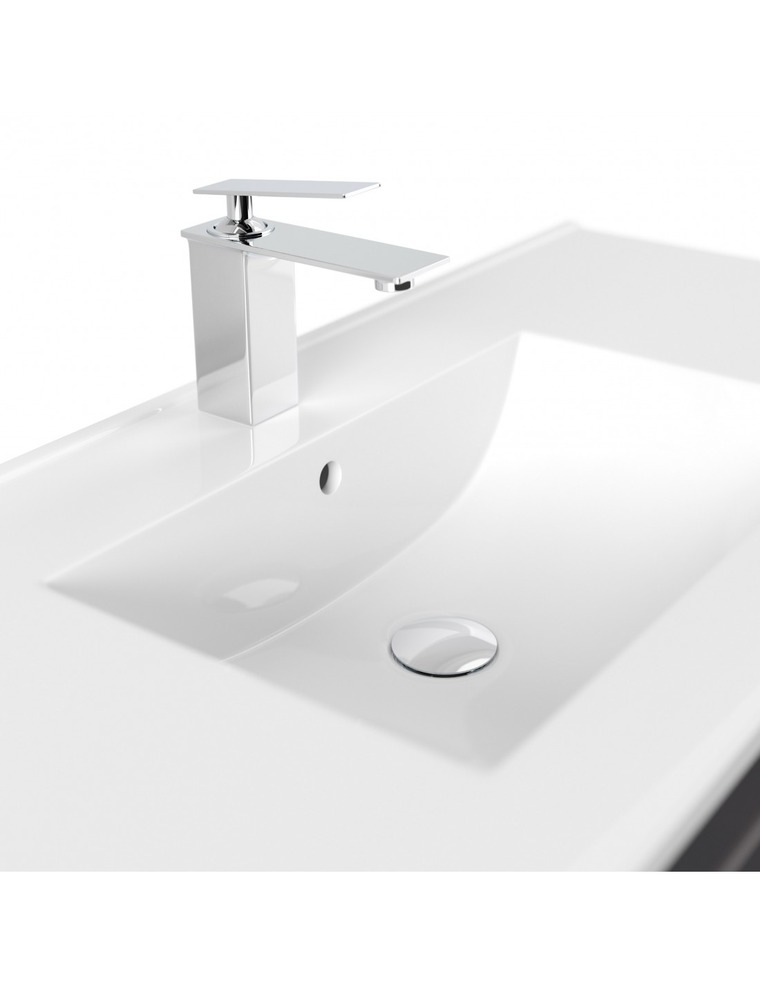 Komplet badmiljø med vask, udført i et design af mdf og mineralsten. Badmiljøet måler 56,1 cm i højden og 101 x 46,5 cm i bredde og dybde.