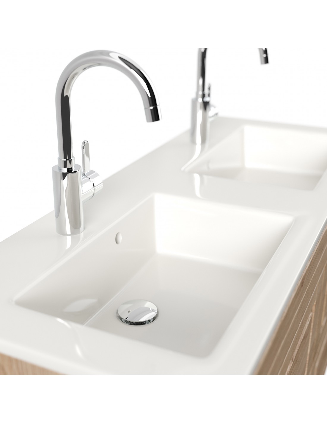 Komplet dobbelt badmiljø med vask, udført i et design af mdf og mineralsten. Badmiljøet måler 60 cm i højden og 120 x 46 cm i bredde og dybde.