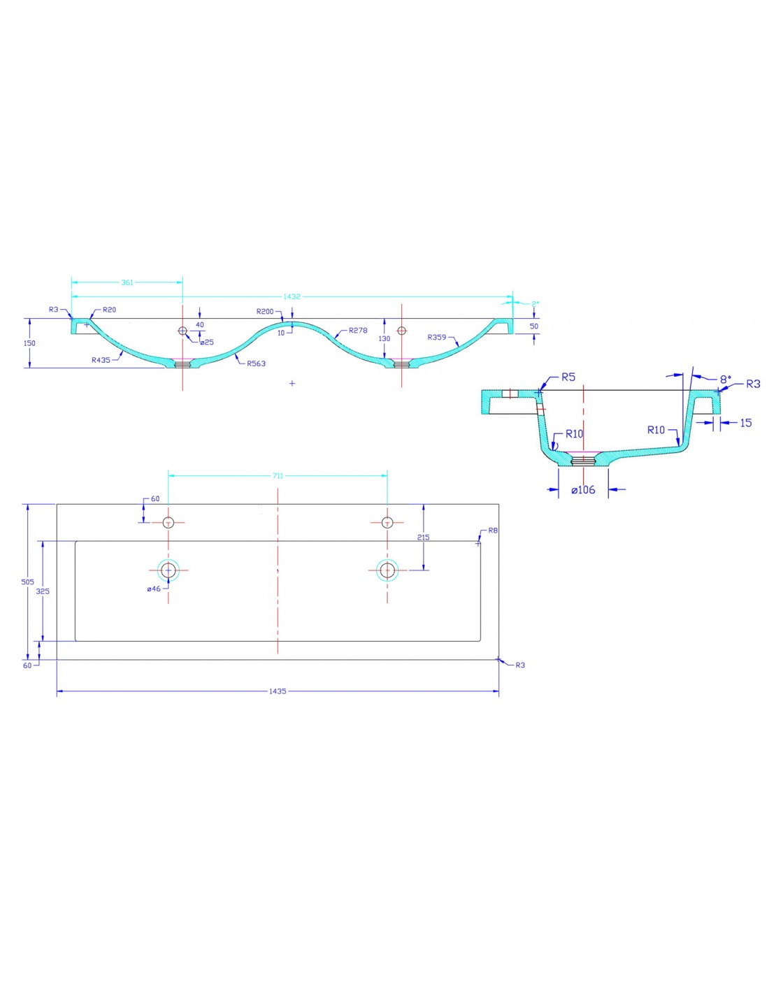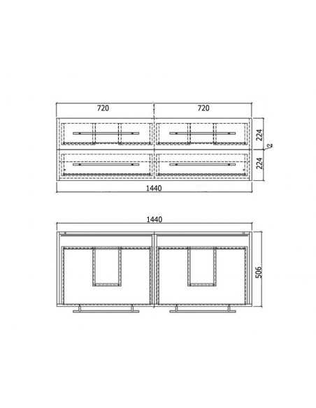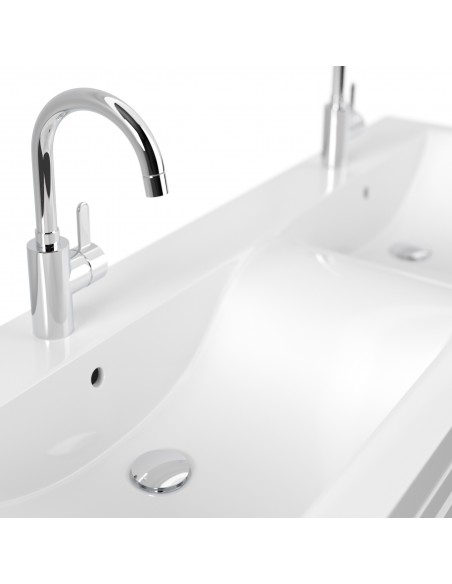 Komplet dobbelt badmiljø med vask, udført i et design af mdf og mineralsten. Badmiljøet måler 56,5 cm i højden og 143,4 x 50,5 cm i bredde og dybde.