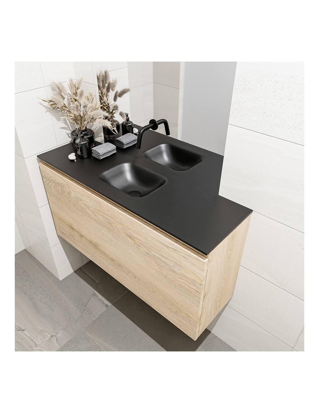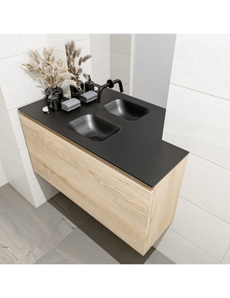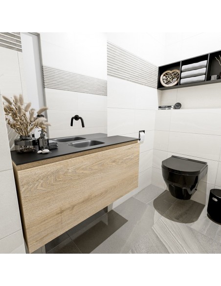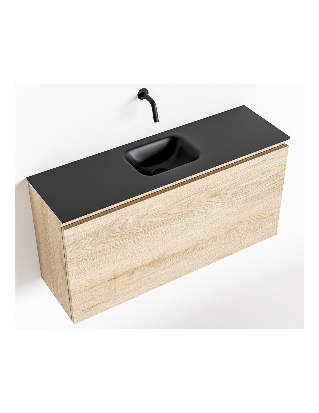 OLAN Komplet badmiljø med midt centreret håndvask til vægmonteret armatur. Badmiljøet kommer med 1 skuffe med fuldt udtræk, og er fremstillet i MDF med design af vasket eg. Håndvasken er fremstillet i sort solid surface. Badmiljøet måler 100 cm i bredden. Det viste armatur medfølger ikke i sættet.