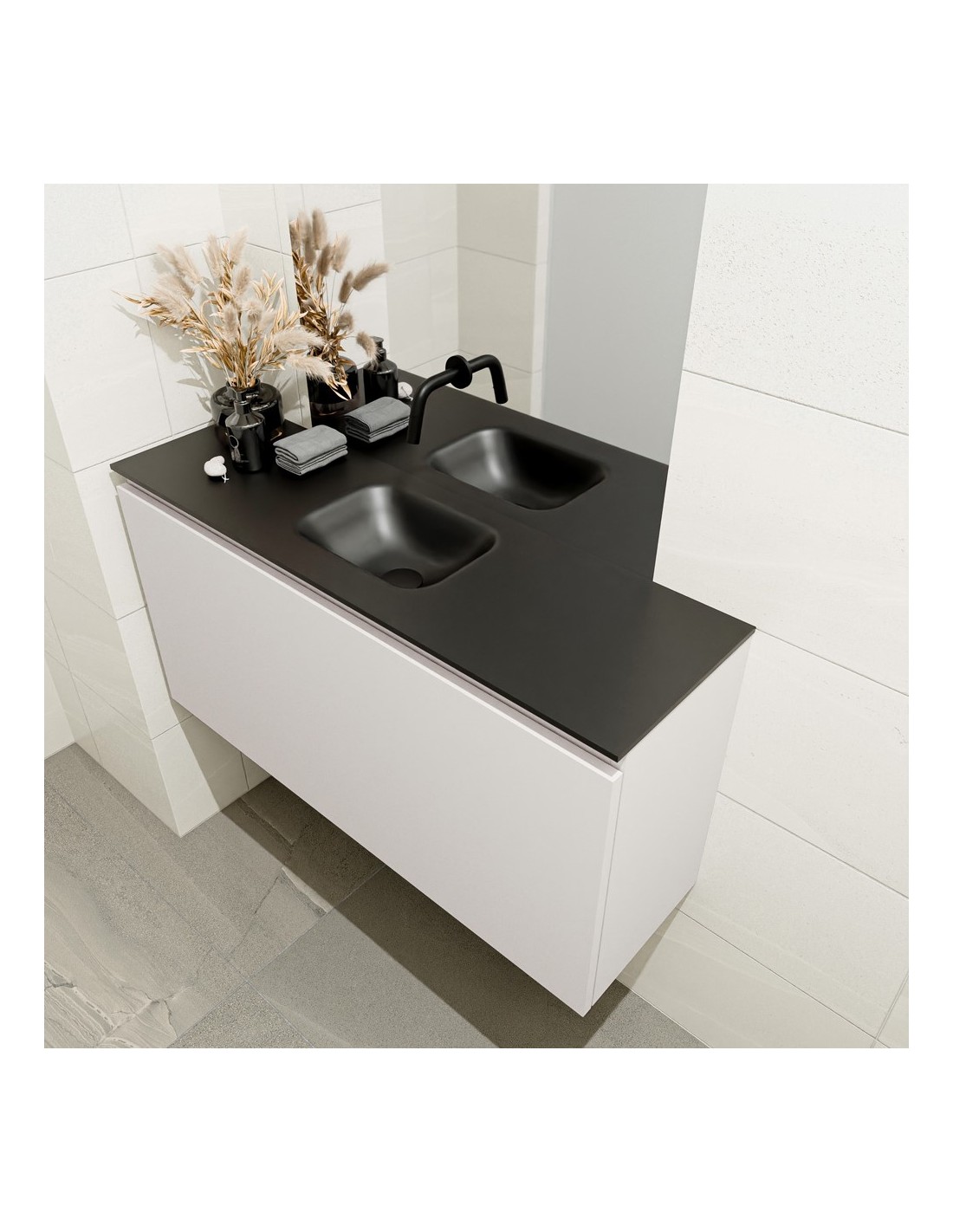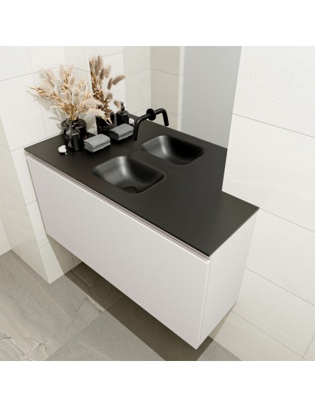 OLAN Komplet badmiljø med midt centreret håndvask til vægmonteret armatur. Badmiljøet kommer med 1 skuffe med fuldt udtræk, og er fremstillet i MDF. Håndvasken er fremstillet i sort solid surface. Badmiljøet måler 100 cm i bredden. Det viste armatur medfølger ikke i sættet.