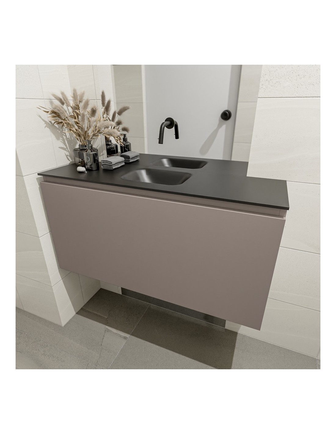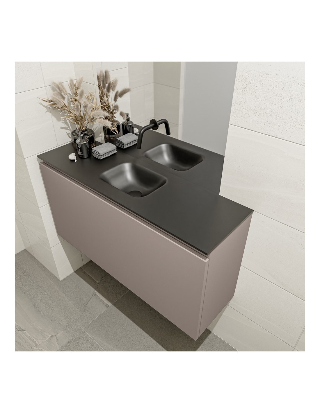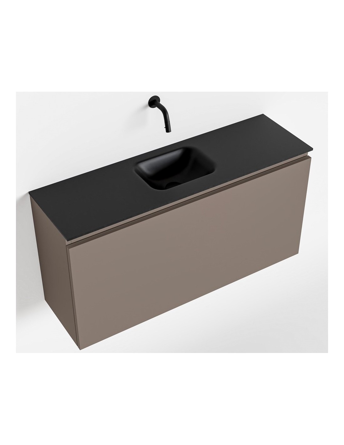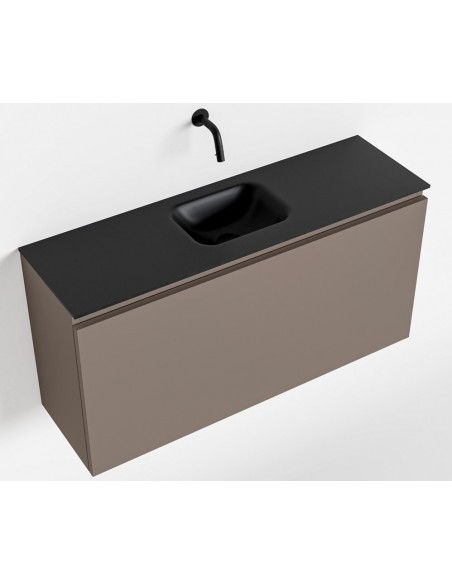 OLAN Komplet badmiljø med midt centreret håndvask til vægmonteret armatur. Badmiljøet kommer med 1 skuffe med fuldt udtræk, og er fremstillet i MDF. Håndvasken er fremstillet i sort solid surface. Badmiljøet måler 100 cm i bredden. Det viste armatur medfølger ikke i sættet.