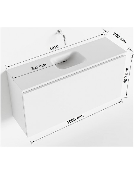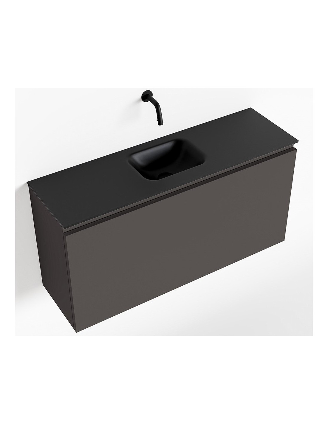 OLAN Komplet badmiljø med midt centreret håndvask til vægmonteret armatur. Badmiljøet kommer med 1 skuffe med fuldt udtræk, og er fremstillet i MDF. Håndvasken er fremstillet i sort solid surface. Badmiljøet måler 100 cm i bredden. Det viste armatur medfølger ikke i sættet.