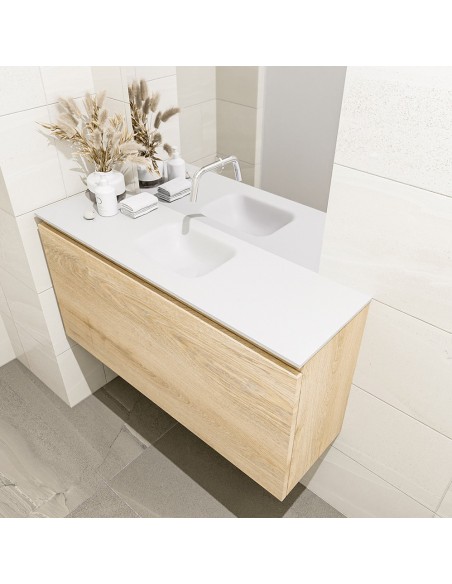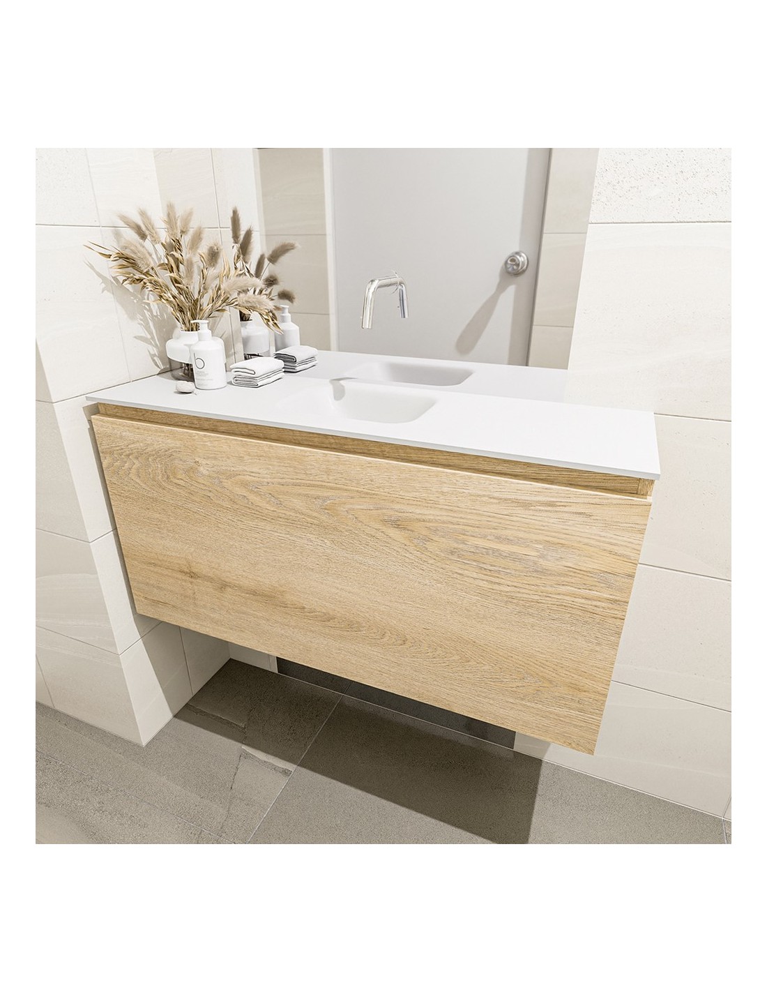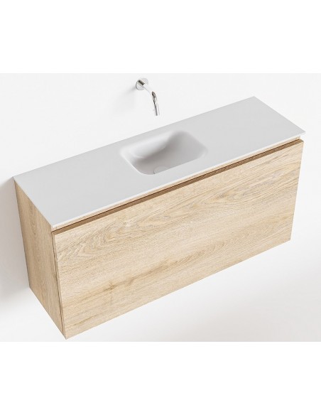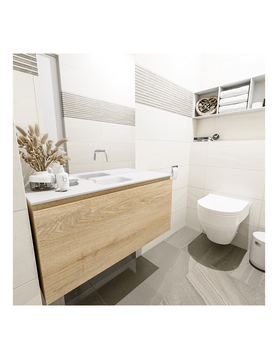 OLAN Komplet badmiljø med midt centreret håndvask til vægmonteret armatur. Badmiljøet kommer med 1 skuffe med fuldt udtræk, og er fremstillet i MDF med design af vasket eg. Håndvasken er fremstillet i talkumsfarvet (mat hvid) solid surface. Badmiljøet måler 100 cm i bredden. Det viste armatur medfølger ikke i sættet.