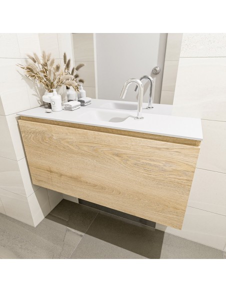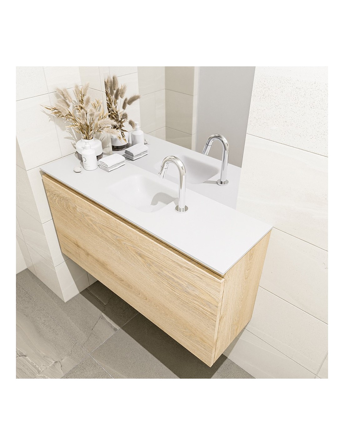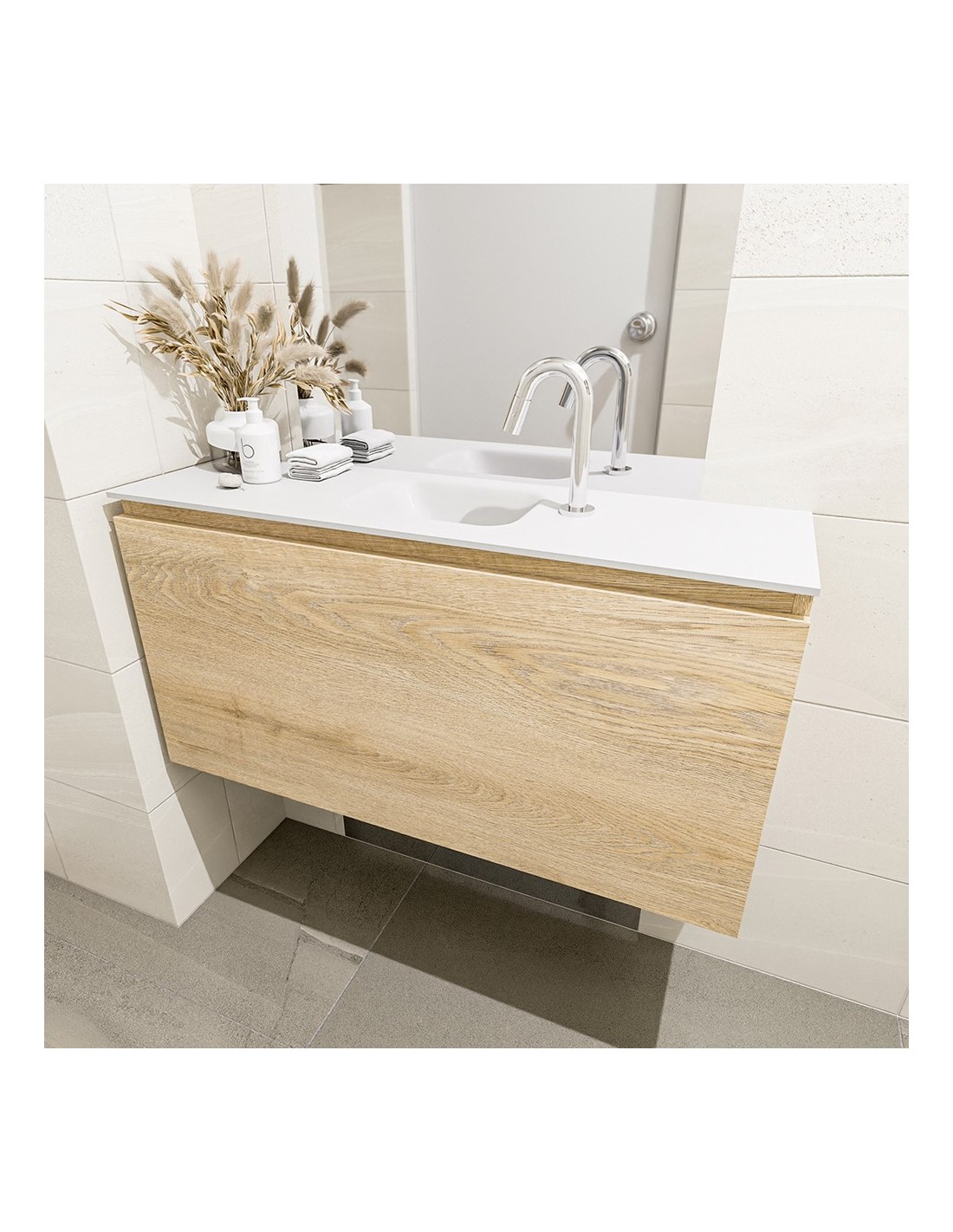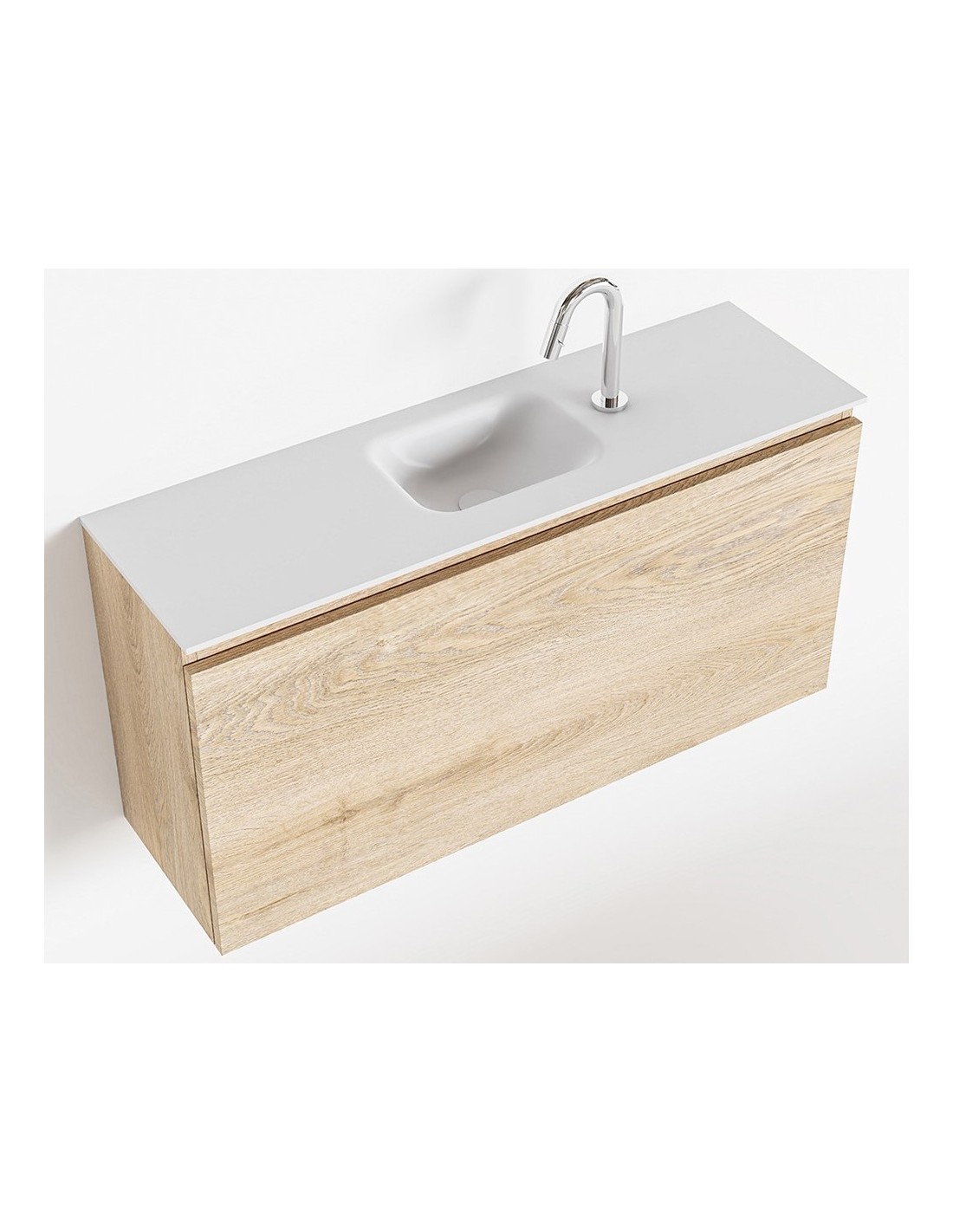 OLAN Komplet badmiljø med midt centreret håndvask til bordmonteret armatur. Badmiljøet kommer med 1 skuffe med fuldt udtræk, og er fremstillet i MDF med design af vasket eg. Håndvasken er fremstillet i talkumsfarvet (mat hvid) solid surface. Badmiljøet måler 100 cm i bredden. Det viste armatur medfølger ikke i sættet.