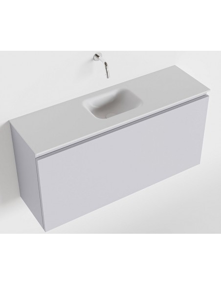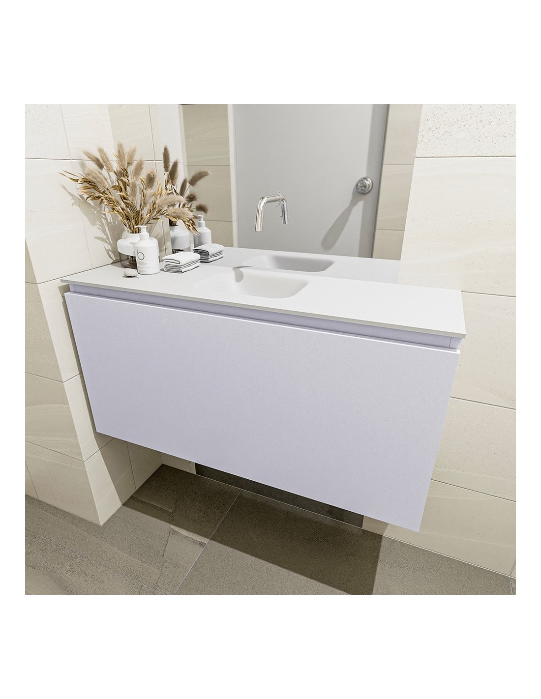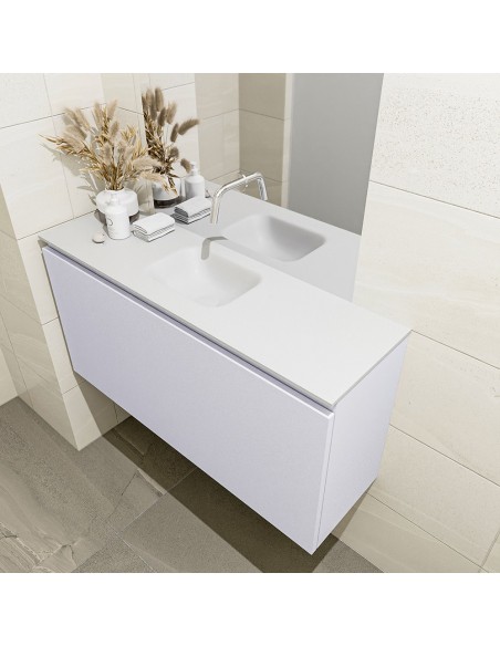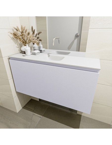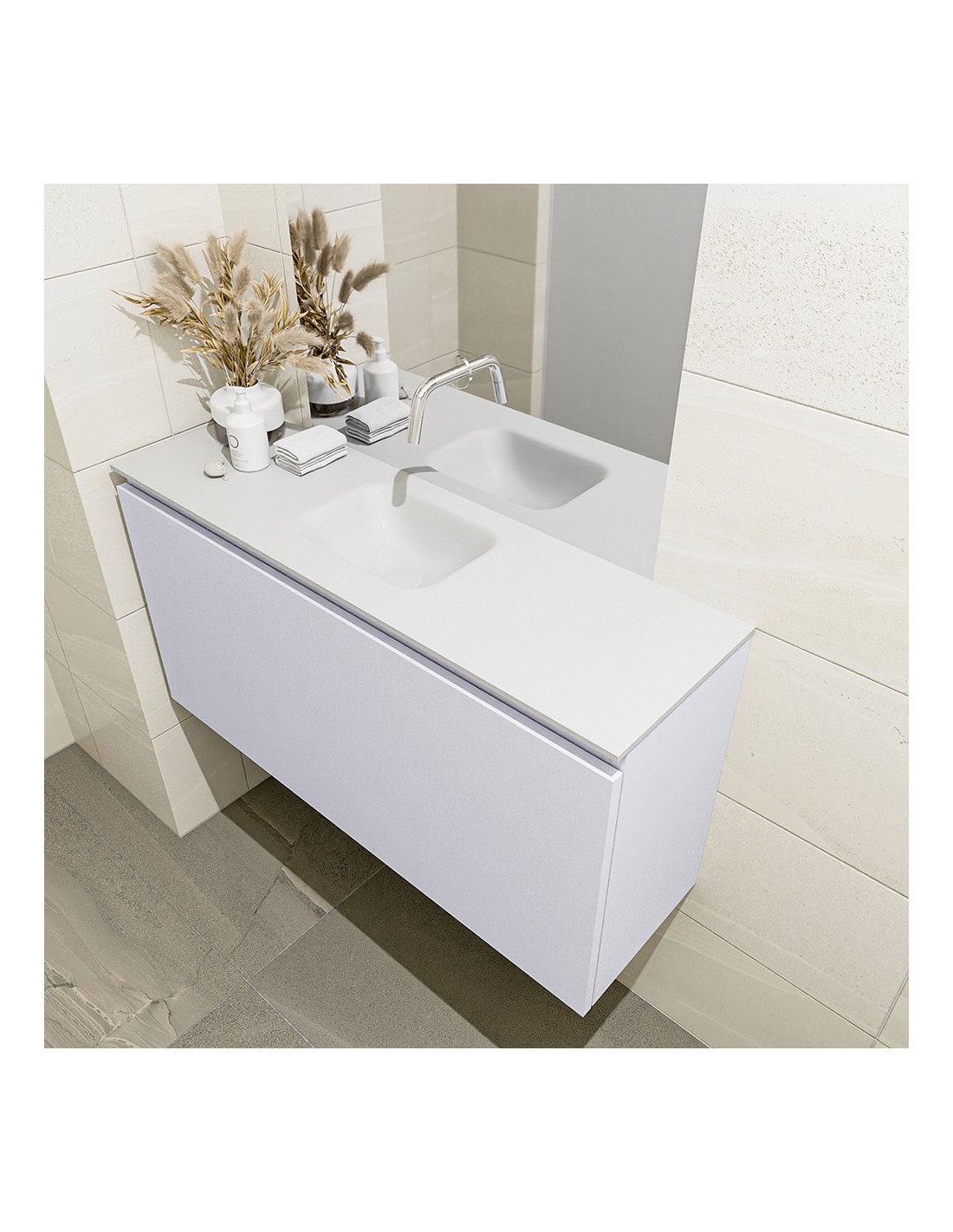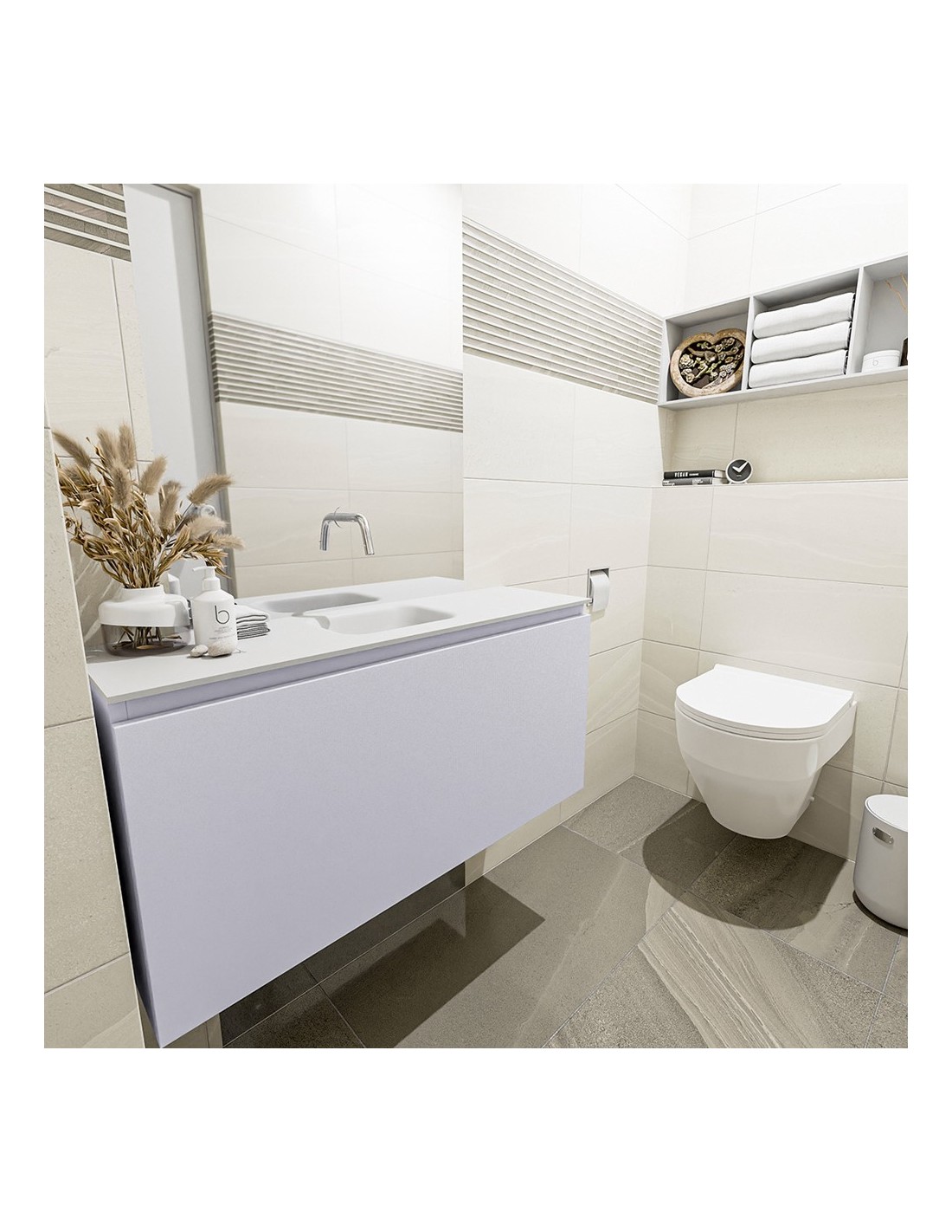 OLAN Komplet badmiljø med midt centreret håndvask til vægmonteret armatur. Badmiljøet kommer med 1 skuffe med fuldt udtræk, og er fremstillet i MDF. Håndvasken er fremstillet i talkumsfarvet (mat hvid) solid surface. Badmiljøet måler 100 cm i bredden. Det viste armatur medfølger ikke i sættet.