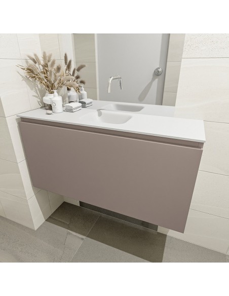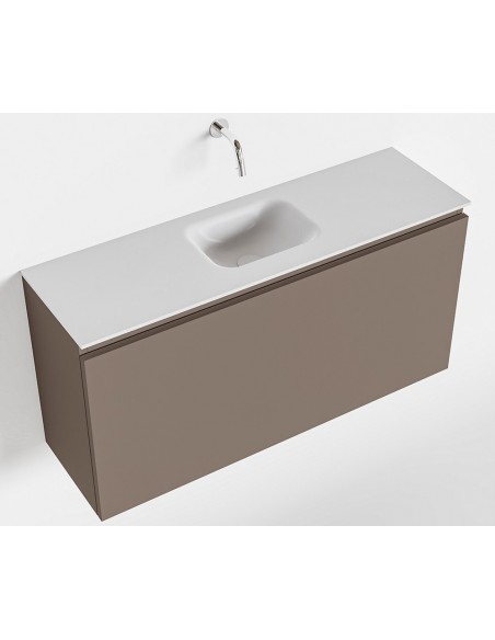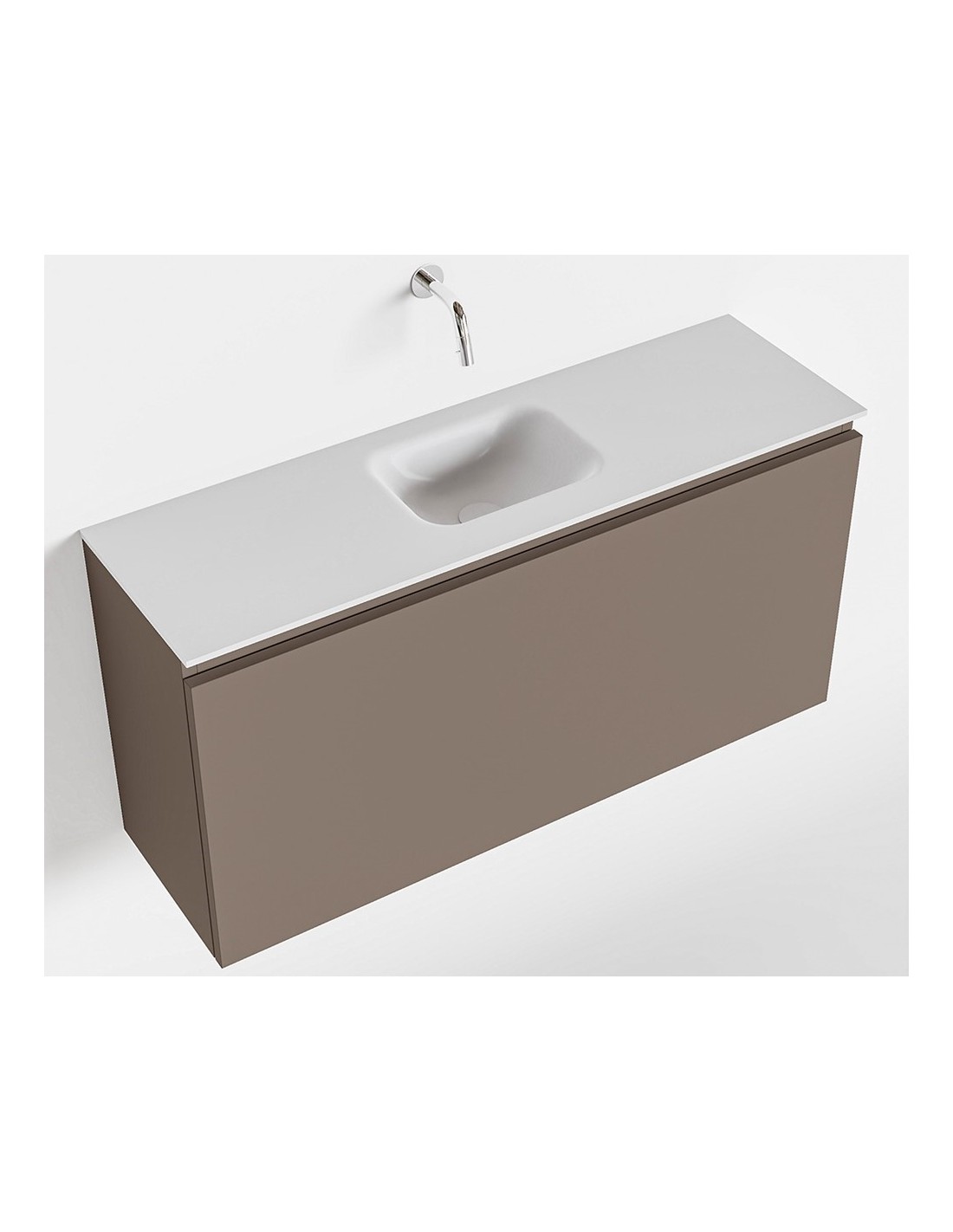 OLAN Komplet badmiljø med midt centreret håndvask til vægmonteret armatur. Badmiljøet kommer med 1 skuffe med fuldt udtræk, og er fremstillet i MDF. Håndvasken er fremstillet i talkumsfarvet (mat hvid) solid surface. Badmiljøet måler 100 cm i bredden. Det viste armatur medfølger ikke i sættet.