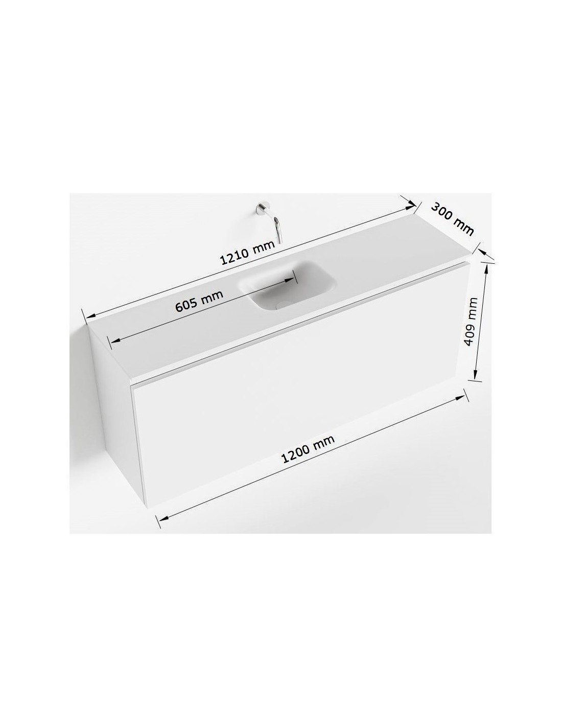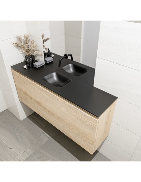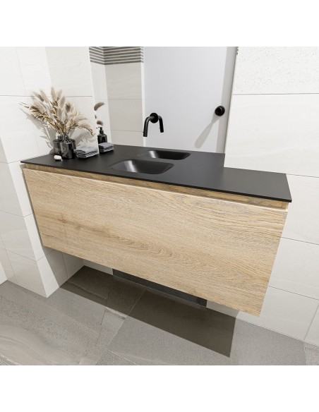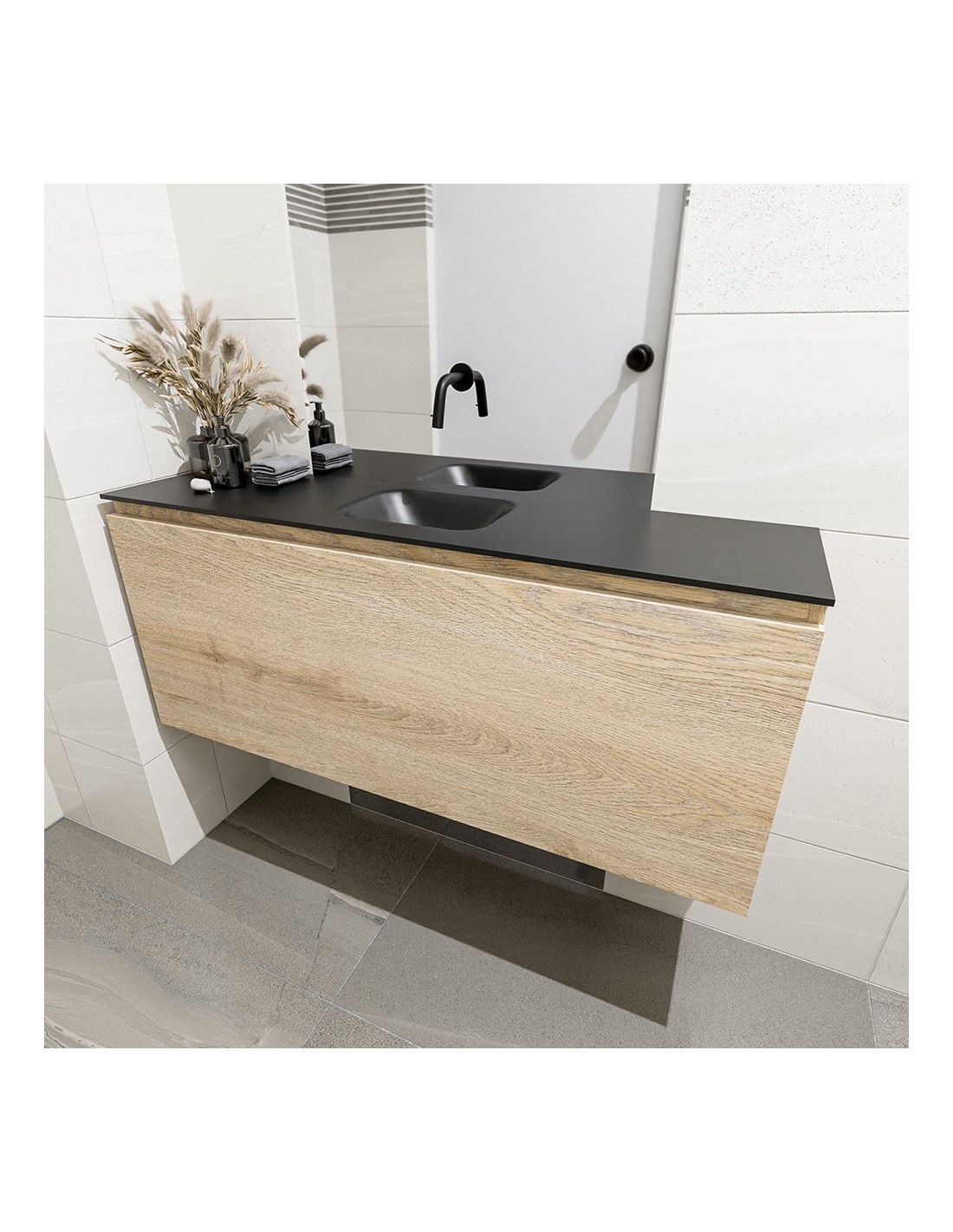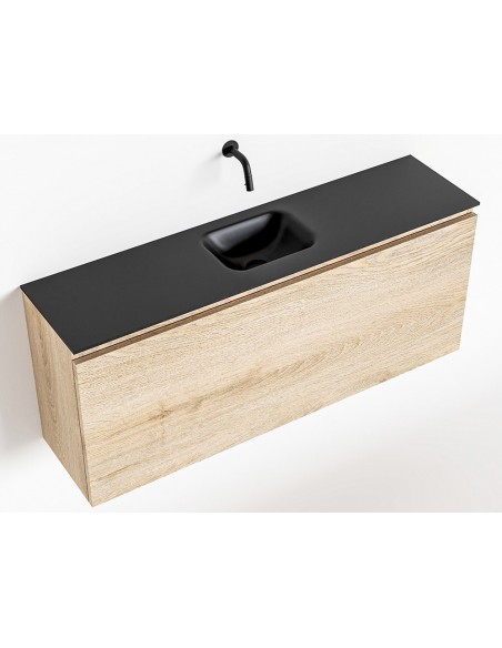 OLAN Komplet badmiljø med midt centreret håndvask til vægmonteret armatur. Badmiljøet kommer med 1 skuffe med fuldt udtræk, og er fremstillet i MDF med design af vasket eg. Håndvasken er fremstillet i sort solid surface. Badmiljøet måler 120 cm i bredden. Det viste armatur medfølger ikke i sættet.